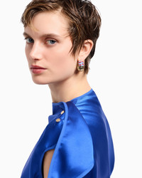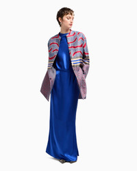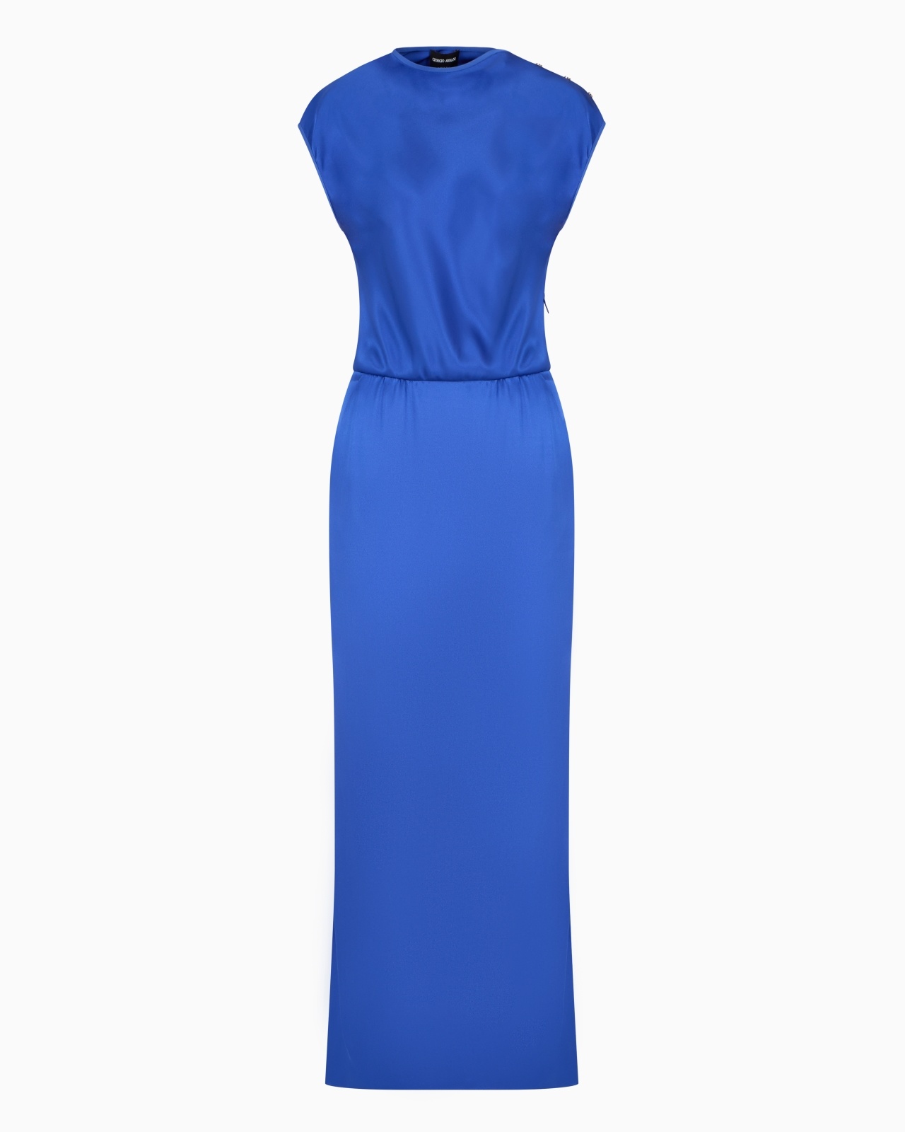 Clean, essential lines define this long dress in double silk satin. The style features a slightly raised collar, short cap sleeves and side slits. Embellished with a panel detail on the left shoulder, it is an elegant and sophisticated piece that is perfect for evening wear, especially when illuminated with exquisite accessories. Slight upright collar Short cap sleeves Panel detail on left shoulder closed by three buttons Two side pockets Side slits Unlined Made in Italy Product Code: GW000678TE10101UB088
