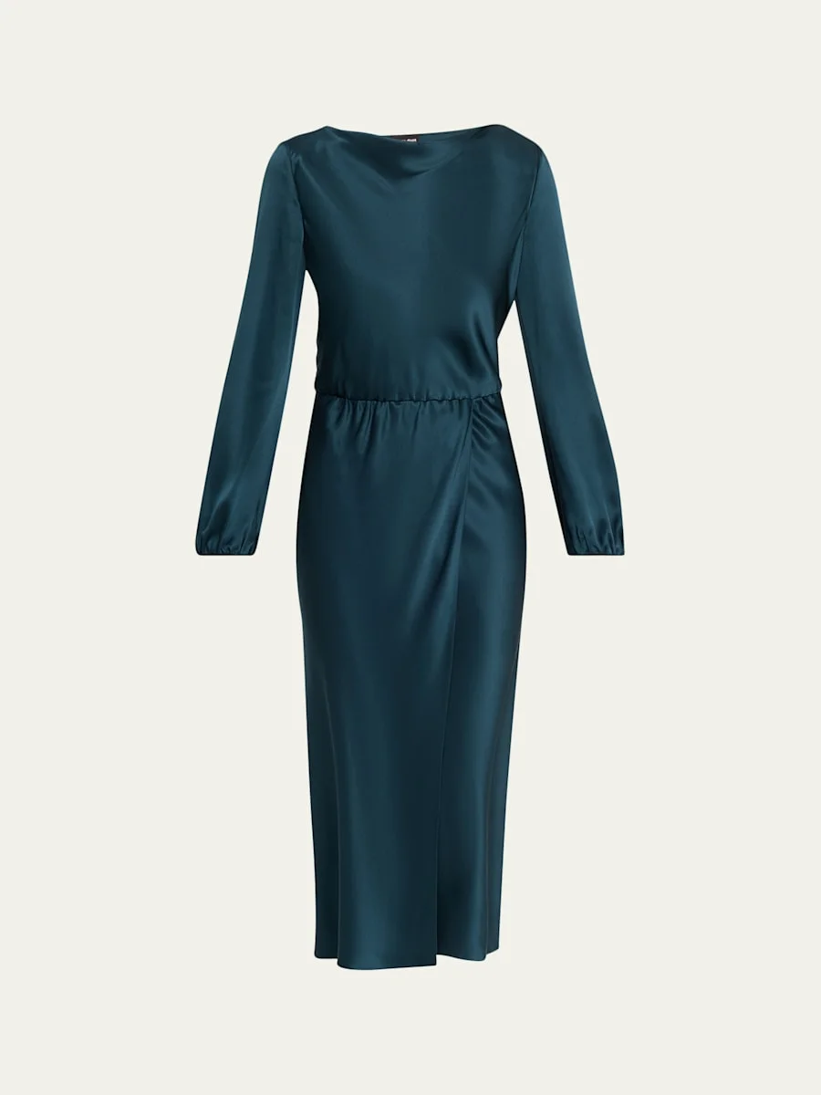 Crafted from lustrous satin, this dress from Giorgio Armani features a gathered elasticized waistband and a wraplike skirt with a side slit High neckline Long sleeves Elasticated waist Sheath silhouette Hem falls below the knee Slipover style Viscose Made in Italy SIZE amp; FITModel measurements: 5'10" tall Model is wearing a US size 4/Small