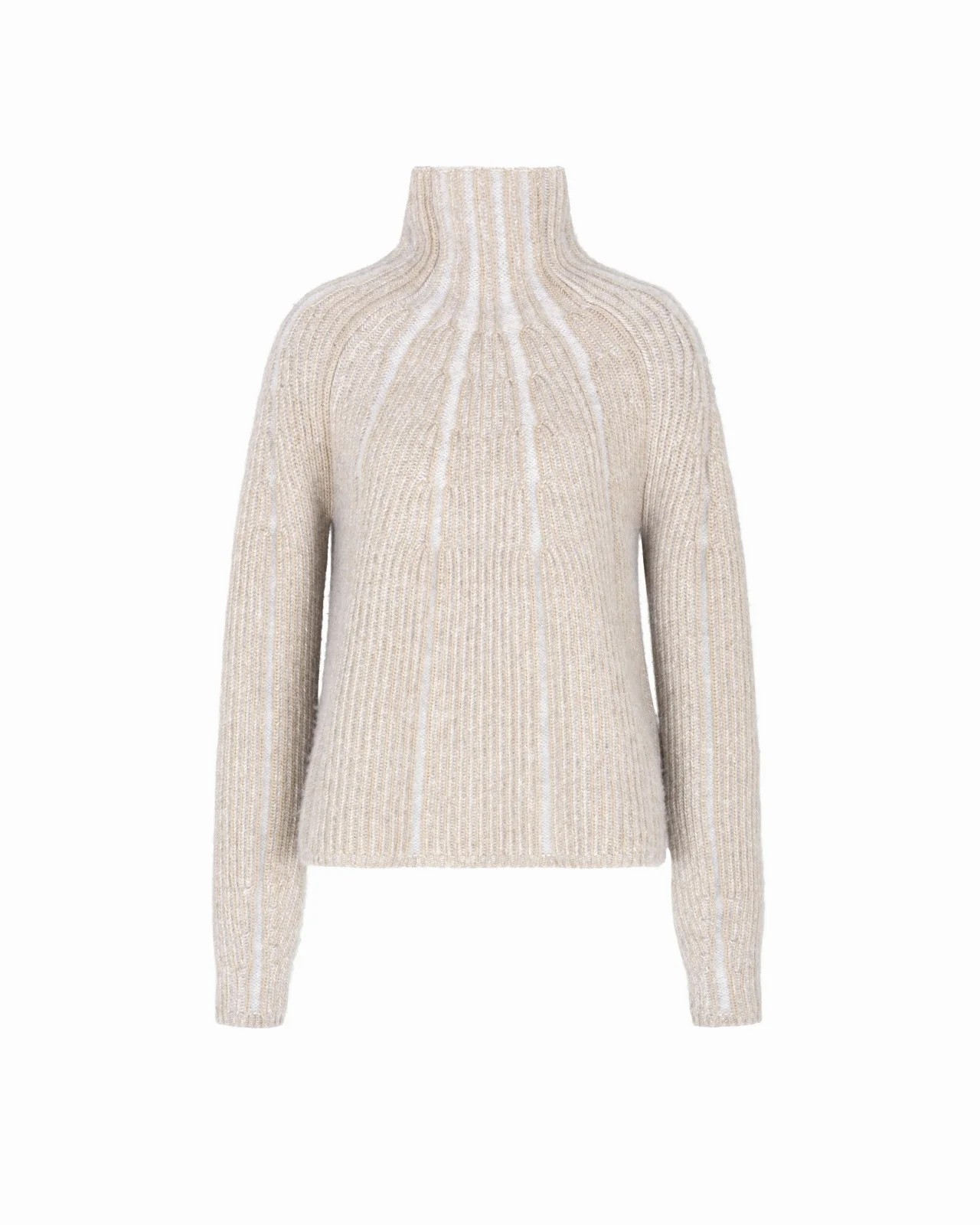 Warm and cosy mock-neck jumper made of virgin wool, cashmere and silk, embellished with a fisherman’s rib, interspersed with lighter stripes that create a gradient effect. A sophisticated style, available in a light and neutral very versatile colour palette, designed to complete daytime looks. The piece is part of the New Normal selection, an offering that reinterprets the brand’s archive looks with a modern twist. Pieces in elongated and fluid shapes and with an androgynous flavour dress the feminine silhouette with elegance for day-to-night looks. This season it comes in a natural colour palette animated by a series of chevron motif and houndstooth shapes, a clear reinterpretation of pieces "stolen" from the male wardrobe with a feminine twist. Fineness: 5 Mock neck Fisherman's rib knit Made in Italy Product Code: GW002094AF19698F6017