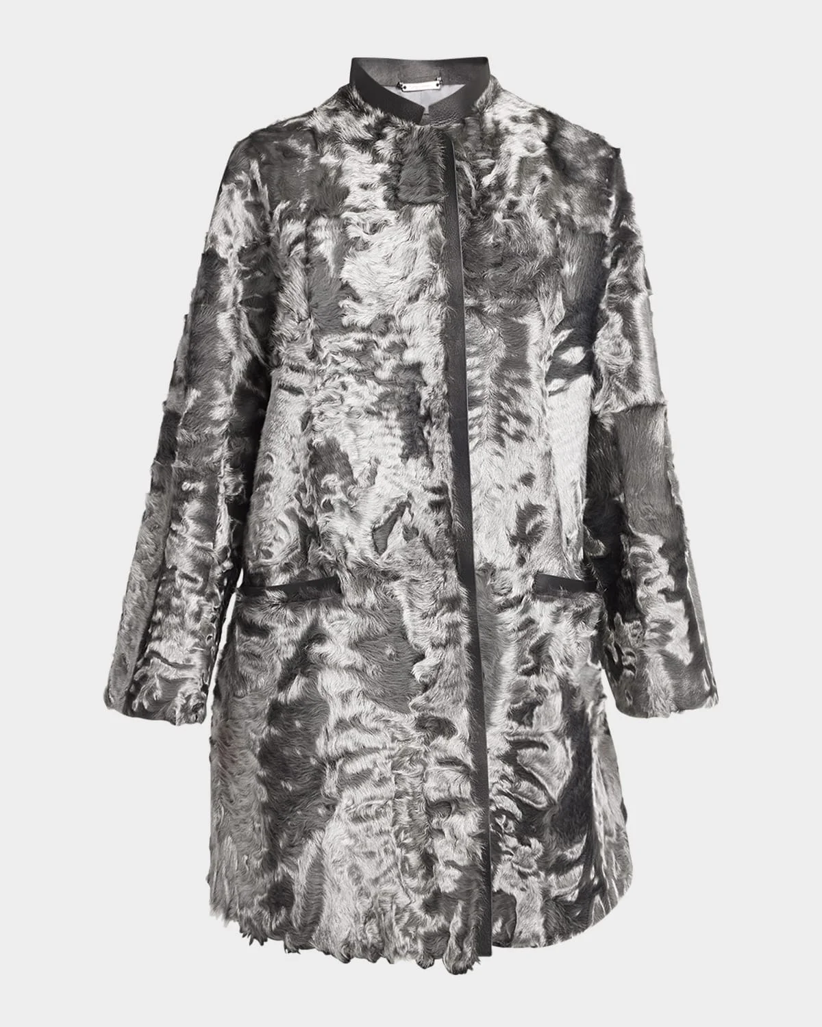 Giorgio Armani collarless top coat is crafted from iridescent dyed curly lamb shearling (Italy) and features supple nappa leather & nbsp;trim and & nbsp;a back martingale adorned & nbsp;with signature silvertone buttons Round neckline; single-breasted front Long sleeves Hip welt pockets Straight fit Hem falls below the hip Concealed snap-button front Dry clean Made in Italy