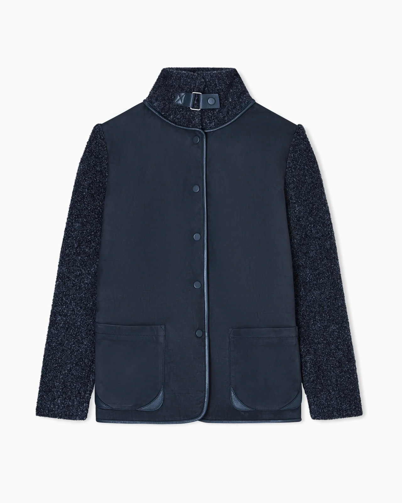 A distinctive texture combination distinguishes this warm, comfortable jacket, featuring a stand collar with a strap and press-stud fastening. The piece has a central insert made of nubuck calfskin, framed by a cosy cashmere and silk knit embellished with boucle. An item designed to impress, enriched by matching glove-quality nappa leather trims, perfect to elegantly accompany daytime looks. Stand collar with strap Front closure with covered press studs Front part made of nubuck calfskin Cashmere and silk boucle collar, sleeves and back Two front patch pockets Matching glove-quality nappa-leather details Unlined interior with nappa-leather strips at the sides Length: 65 cm Made in Italy Product Code: GW002045AF19597M8005