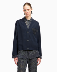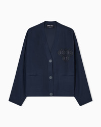 Relaxed-fit jacket, reminiscent of the lines of a sportswear cardigan, made of technical cady, a fabric with ancient origins that maintains its firmness, ensuring precise edges during laser cutting. Over time, it has become one of the brand’s iconic fabrics, and is perfect for giving pieces a modern yet athletic twist. A style with a relaxed attitude featuring a V-neckline, exposed button fastening and front embroidery embellishment in shades of blue, perfect for enhancing daytime looks. V neck Front button closure Long sleeves Two small front welt pockets Front embroidery in shades of blue on the chest Unlined Length: 61 cm from centre back Made in Italy Product Code: GW001954TE10832UB081