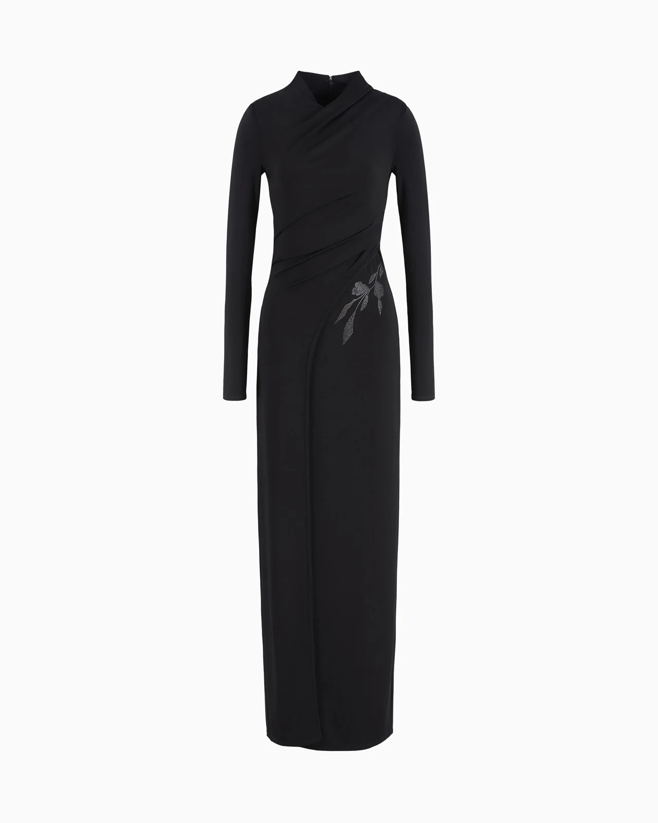 Refined long dress made from stretch viscose jersey sourced from responsible forestry that elegantly follows the feminine silhouette. The style features a slightly raised crossover neckline, front draping with a small slit and an exquisite detail on the left side, embellished with a floral motif created from heat-adhesive rhinestones. A sophisticated piece that is perfect for special occasions. Product Code: 6DAA65AJZKZ1UC99 Details Composition 98% Viscose 2% Elastane The fabric is made of 98% viscose from responsible forestry Crossover neckline Long sleeves Slight front draping Large front slit Matching floral embroidery on the left side with rhinestones Fitting The model is 178 cm tall and is wearing size 38/S
