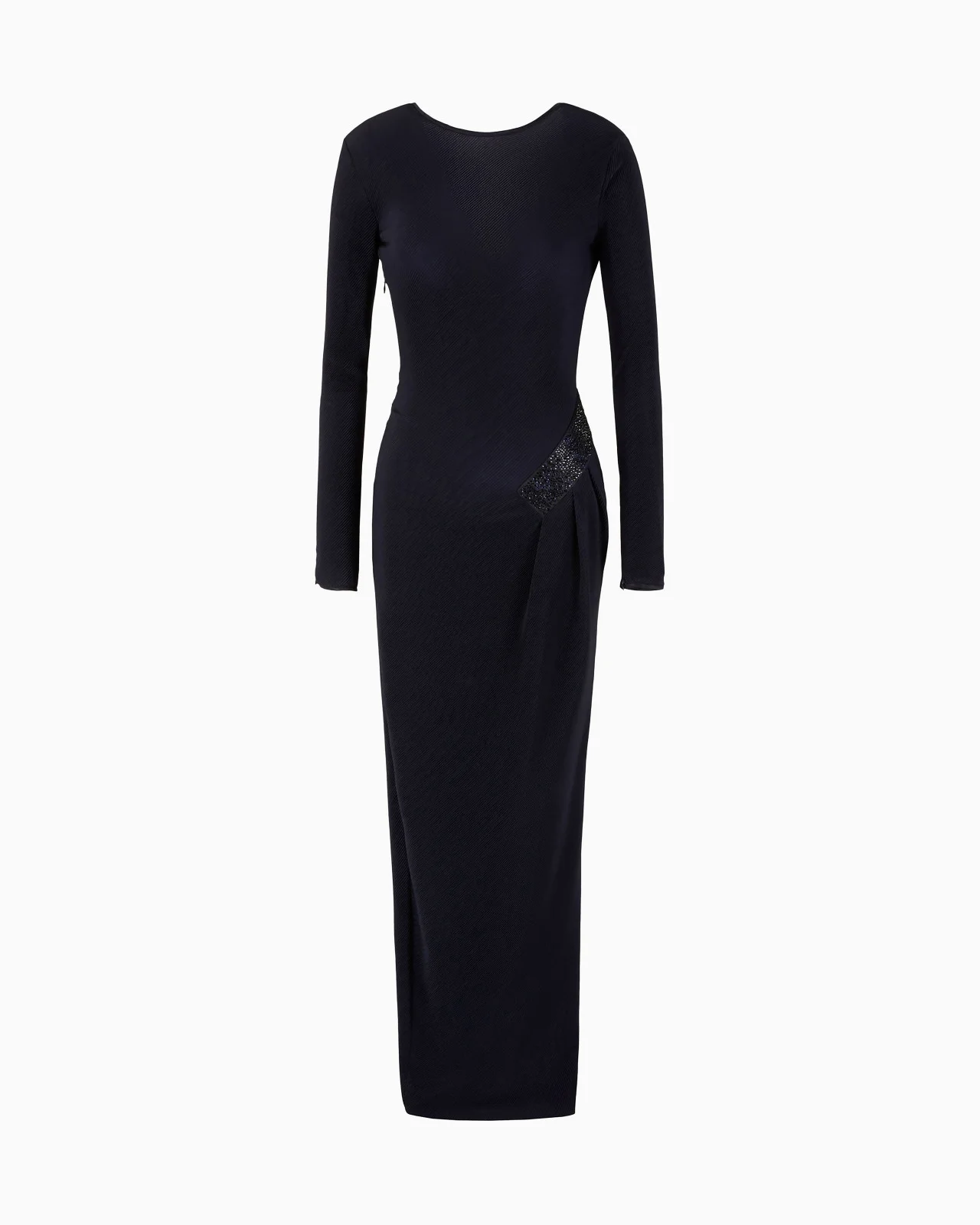 A true Pink revolution, one that captures the essence of the pieces in the Holiday collection. Vibrant fuchsia is combined with pearl grey, black and blue, giving attitude to clothing with fluid lines and proportions and effortless wearability, for style that recalls 1990s Armani, giving it an update with unexpected splashes of colour. This long dress is made of stretch jersey which is soft to the touch and comfortable to wear. The garment features a pleated motif and an insert with graduated crystal embroidery which falls from the waist down one side. An elegant, sophisticated dress, perfect for a variety of occasions. Product Code: 3RAA50AJLXZ1UBMF Details Composition 58% Triacetate 42% Polyester Crew neck Long sleeves Matching satin trims Side zip closure Detailing at the waist and right hip with matching graduated crystal embroidery Plunging rear V-neck Zipped sleeve cuffs Made in Italy