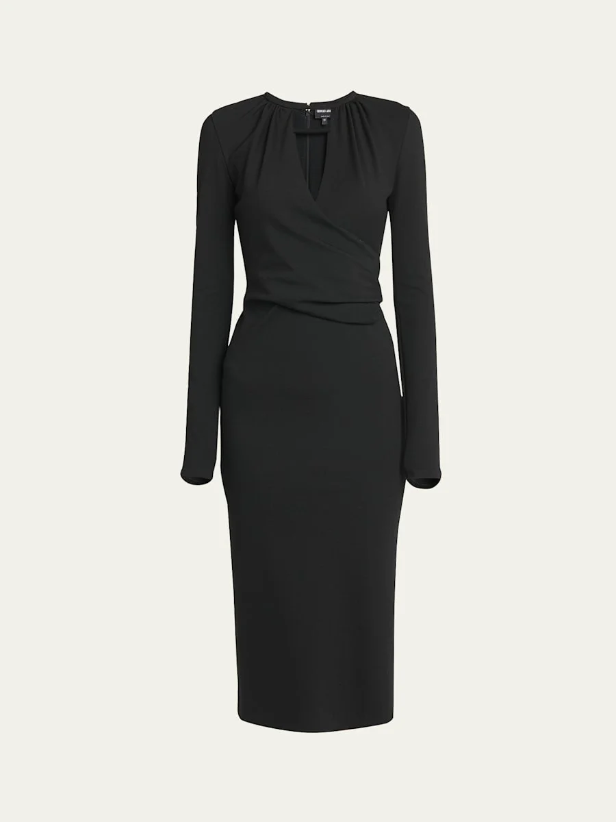 Giorgio Armani Milano jersey midi dress features a wrap front bodice with a keyhole cutout Round neckline Long sleeves Hem falls below the knee Back center slit Back zip closure Sheath silhouette Viscose/nylon/polyamide Dry clean Made in Italy Model is 5'10"/177cm. Online Inquiries: BGS21_T5V33| Store Inquiries: #4833456