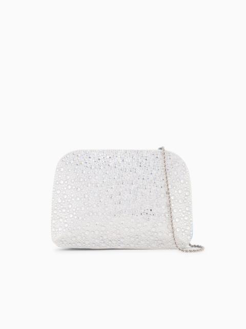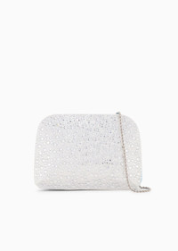 Hardcase clutch bag made of satin, with a line that recalls a '90s aesthetic, illuminated by a pave of monochromatic rhinestones in different sizes. The bag retains its iconic shape, with rounded lines and darts at the corners, and features light-gold galvanic plating and a practical, detachable jewelled chain. An eye-catching accessory that complements special occasion looks. The accessory is part of an exclusive capsule collection dedicated to special occasions, reflecting the iconic vision of elegance through the brand’s style codes. A glamorous item in a white and silver colour palette, with unexpected touches of turquoise, and shimmering embroideries and appliques that provide sophisticated sparkles. Product Code: Y1C097YWN1A180682 Details Composition 72% Viscose 28% Mulberry silk Magnetic button closure Detachable, bejewelled shoulder strap Light gold plating Contrasting inner lining Measurements: 21 x 15 x 4 cm Made in Italy