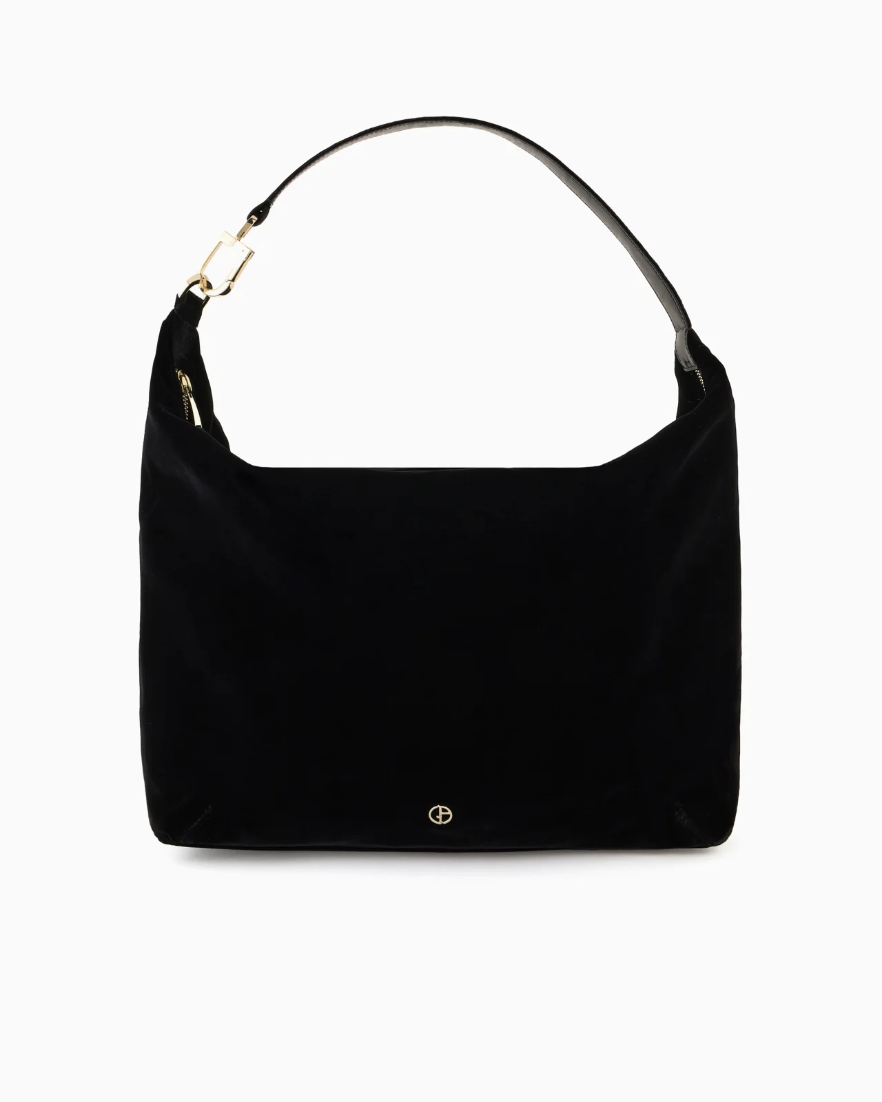Deconstructed and generous volumes for this hobo bag made of shiny, luxurious collection velvet. A style that retains the flowing lines that distinguish the bags of the la Prima Soft family, featuring an adjustable and detachable double handle that allows it to be carried by hand or worn on the shoulder. The zip fastening encloses a spacious and well-organised interior with two pockets, one of which is zipped. A special accessory, the perfect complement to many looks and ideal for holding all your essentials. Dual handle for carrying by hand and shoulder Zip closure Jewelled GA logo Antique gold-finish metal plating Interior pocket with zip One internal patch pocket Measurements: 40 x 31 x 23 cm Made in Italy Product Code: Y1E244YWA5A80001