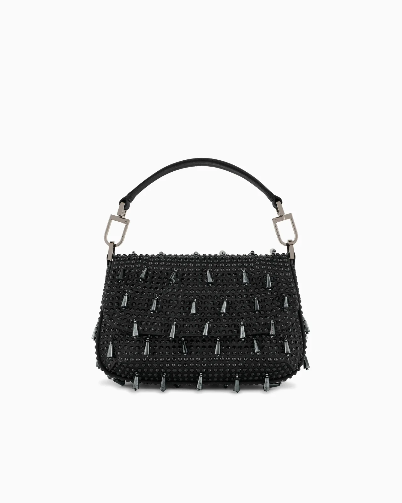 A new take on the la Prima Soft family, available in a sparkling evening version. Crafted in satin and entirely covered in matching rhinestones and teardrop beads, it features a clip-detachable handle, an adjustable and detachable shoulder strap that allows it to be worn two ways and a flap closure with a concealed magnetic button. An irresistible accessory, crafted with utmost attention to detail, perfect for completing looks for special occasions.<br>The accessory is part of the exclusive collection that celebrates the connection between Giorgio Armani and the world of Hollywood. A colour palette of deep blues combines with a profound and ever-elegant black, to create a sparkling, luxurious selection inspired by the limelight and most exclusive Hollywood parties. Extremely sophisticated pieces with iconic lines are made of velvets, silks and satins enlivened by crystal and rhinestone embellishments and refined workmanship. Looks for him and her, designed for evenings and special occasions. Flap closure with central magnetic covered button Handle with clip detachment Second removable and adjustable shoulder strap for wearing in two ways Satin lining One internal patch pocket Measurements: 25 x 11 x 13 cm Made in Italy Product Code: GW000564AF18143UC001