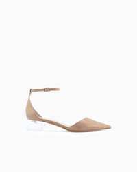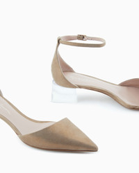 Elegant d'Orsay court shoes made from suede with a distinctive laminated finish. The style features a slightly asymmetric top line and transparent geometric heel and comes in the subtle shades of the collection, inspired by nature. Delicate and feminine, they will complete numerous looks with a sophisticated touch. Product Code: X1D331XF774101792 Details Composition 100% Goat skin Pointed toes Slightly asymmetric top line Ankle strap Geometric transparent heel Width: 3.5 cm Leather soles Made in Italy