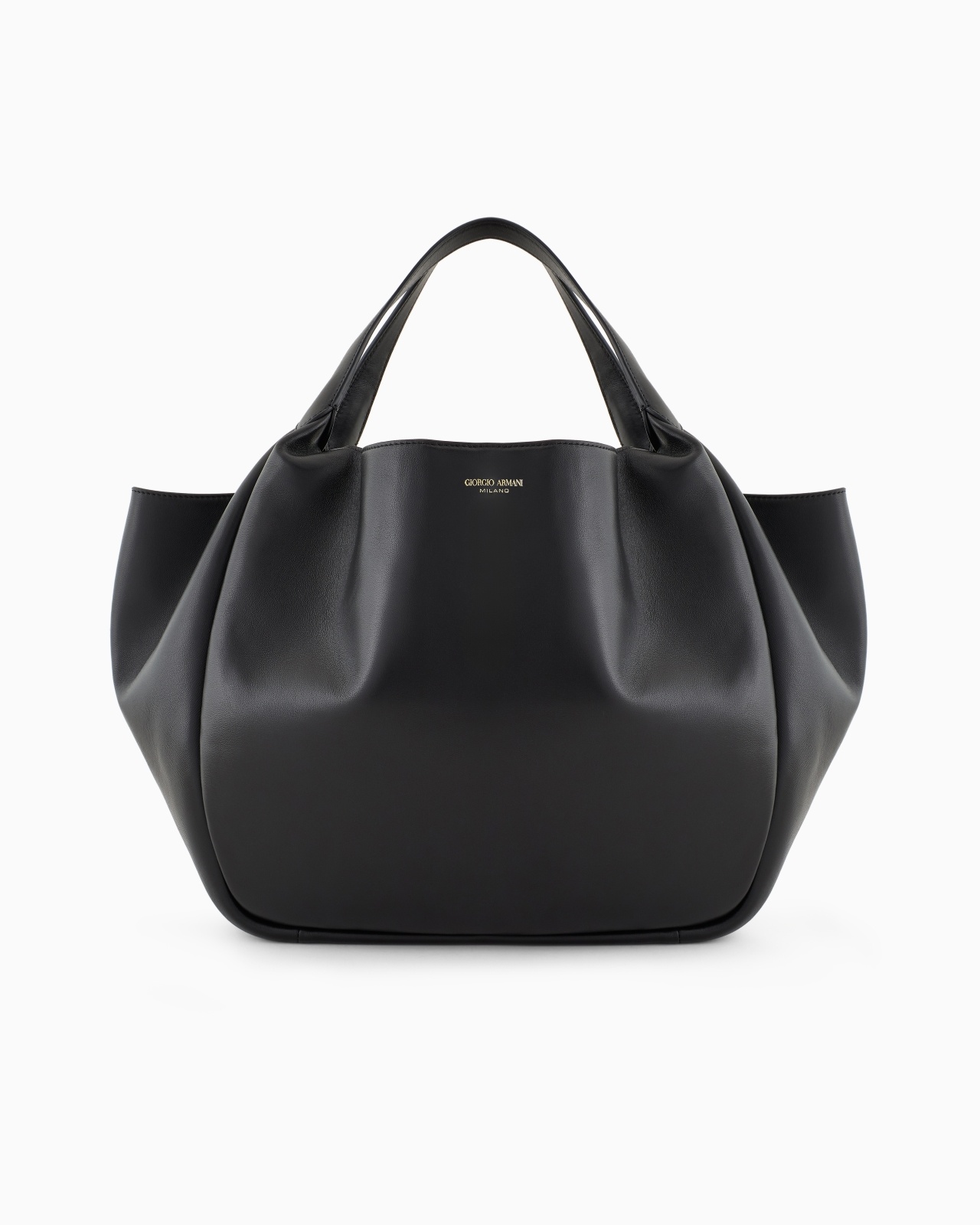 Generous volumes and a laid-back attitude for this large hobo bag made from supple nappa leather. The style features a concealed magnetic closure and a convenient removable interior pouch perfect for holding your mobile phone and keys. An deconstructed item and an expression of the iconic Giorgio Armani ready-to-wear style, extremely supple and lightweight, perfect for the day. Concealed magnetic closure Double handles Inner pochette with zip closure Heat-stamped Giorgio Armani logo Measurements: 40 x 32 x 25 cm Made in Italy Product Code: Y1E249YYB6D80001
