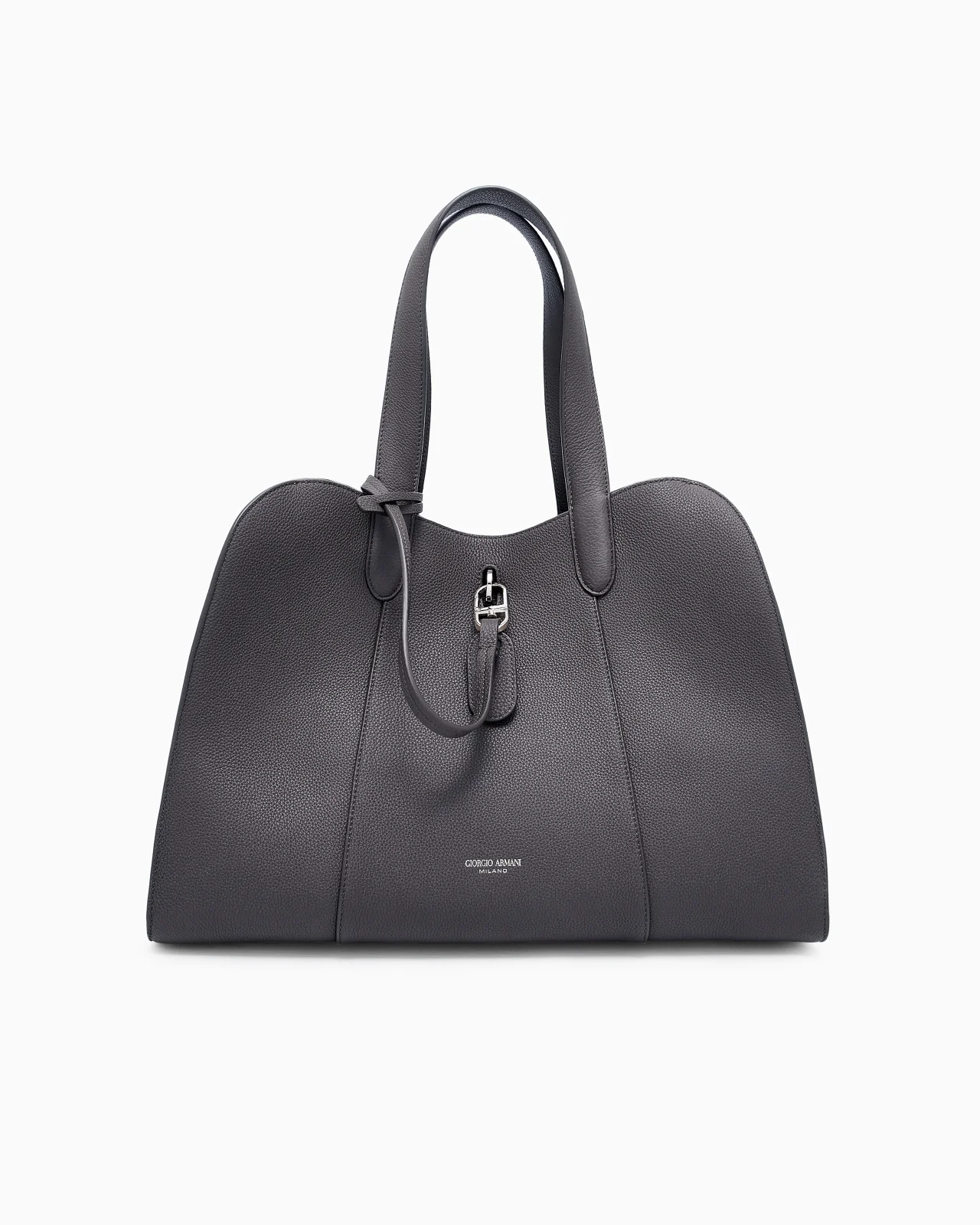 Practical and spacious tote bag, made of pebbled calfskin that can be worn on the shoulder or carried by hand. This lightweight, deconstructed trapezoid style features a distinctive metal ring and clip closure and a practical zipped inner pocket. A sophisticated piece, the perfect, elegant accessory to daytime looks. Double handles Ring and snap-hook clasp Sides closed with covered press studs Interior zip pocket, patch pocket and heat-stamped Giorgio Armani logo Heat-stamped Giorgio Armani logo on the bag’s front panel Unlined Measurements: 38 x 21 x 26.5 cm Made in Italy Product Code: GW001709AF14187U6032