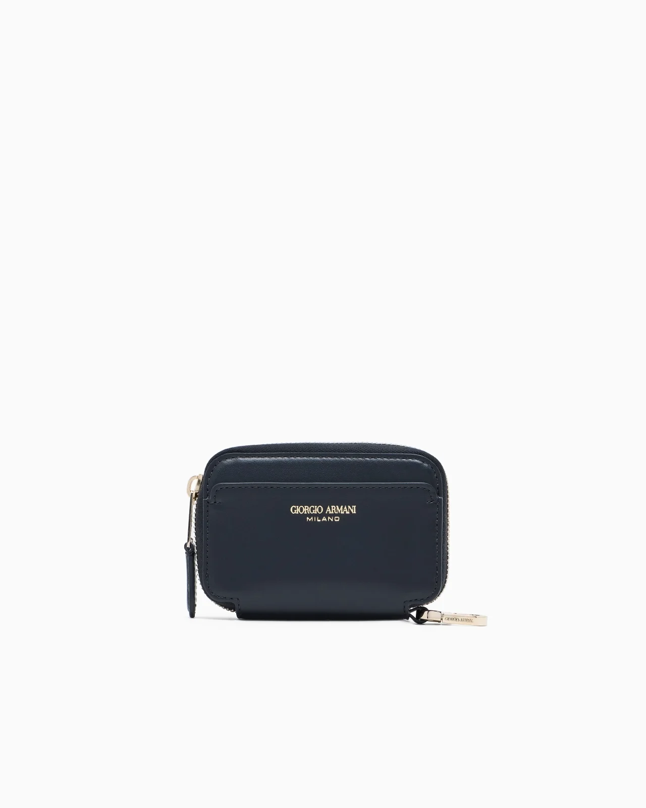 Mini wraparound wallet made of leather with three inner pockets and one outer compartment. The accessory is embellished with elegant gold-coloured branding and, thanks to the small gold-coloured snap hook detail, is perfect for attaching to the collection bags. Zip opening Three inner compartments One outside pocket Gold-coloured metal snap hook Measurements: 9 x 12 x 2.2 cm Made in Italy Product Code: GW001255AF14183UC001