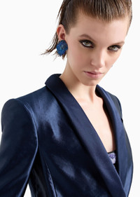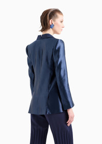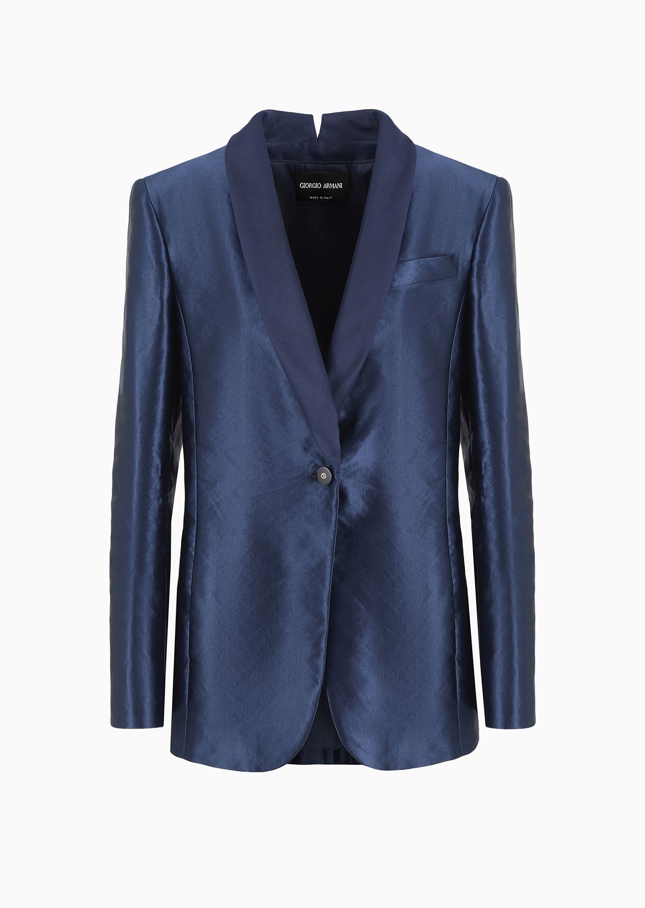 The unique sheen of the silk and linen embellishes this single-breasted jacket available in deep blue. The style features a shawl lapel collar, one-button closure and breast pocket. Small opening details at the back of the neckline and cuffs echo the double vent at the centre back, adding movement to the item’s extremely clean, straight lines. Product Code: GW000142TE109351UB092 Details Composition 54% Linen 46% Mulberry silk Single-breasted jacket Shawl lapels with detail in the centre of the collar One-button single-breasted closure Breast welt pocket Slit in the cuff Lined Length: 68 cm Made in Italy Fitting The model is 178 cm tall and is wearing size 38/S