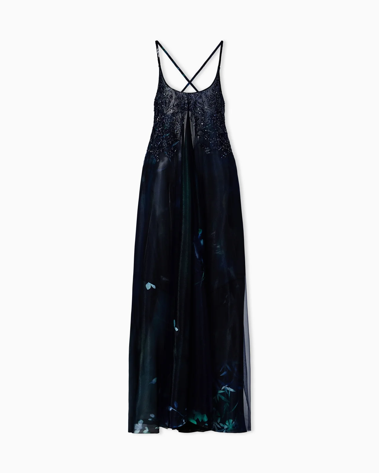 Sparkling and precious, this long dress is made of fabric embroidered with blue and purple beads and sequins and embellished with an under layer of luxurious printed silk. The style features a wide round neckline and thin crossed-over shoulder straps on the back, made with sequins and baguettes that add a touch of light. A sophisticated and elegant offering, perfect for dressing up the most special occasions. Deep round neckline Crossed over shoulder straps on the back covered in sequins Tulle top layer with bodice embroidered in beads and sequins Silk under layer with collection print Lined garment Length: 110 cm from the hip Made in Italy Product Code: GW003302AF25313ZZ017