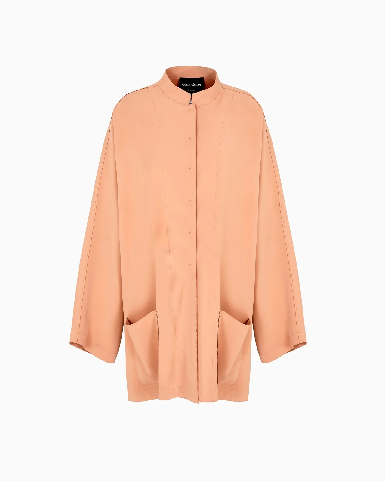 Technical cady long jacket with deconstructed, clean lines available in a clay colour, a hallmark shade of the collection. The style features a stand collar, a distinctive button closure that creates slight gathering and wide sleeves. A versatile addition to daytime looks, this piece has patch pockets and side slits that create movement. Upright collar Concealed button closure Two large patch pockets Loose-fitting long sleeves Side slits Unlined Length: 77 cm Made in Italy Product Code: GW000658TE10832U6090
