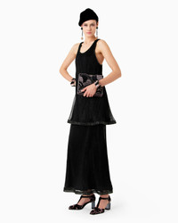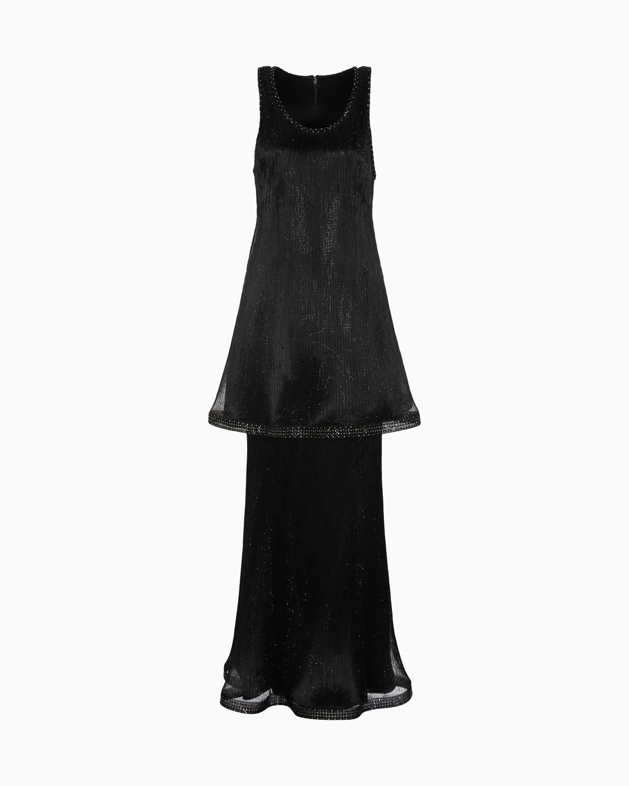 A shower of bright black crystals adorns the lines of this long dress crafted from pleated tulle. The exceptional and exquisite effect is created by the combination of the first layer in pleated tulle with a second layer covered all over in heat-sealed crystals. Embroidered edges with black baguettes finish the piece, with a concealed zip fastening and two lightweight frills adding movement. A piece designed to impress, perfect for evenings. Made in Italy Weight: 0.31 Kilogram Dress skirt shape: Mermaid Dress type: Evening Dress Sleeve length: Sleeveless Product Code: 3WHVR088T04MJPZ01