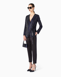 An exclusive and sophisticated style that highlights the fashion house’s skill and craftsmanship for unique designs. This silk jacket is strewn with a shower of delicate, monochromatic, sequin-and-crystal embroidery. It features a knotted strap closure trimmed in crystal piping and tassels. Product Code: 3SHGR034T03WR1UBUV Details Composition 100% Mulberry silk V-neck Fastening with belt and tassels All-over monochromatic embroidery with crystals and long beads Lined Made in Italy