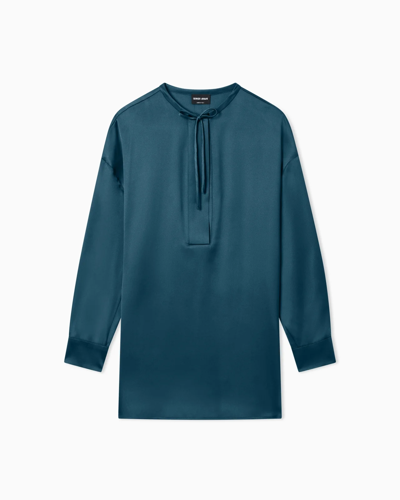 Long silk shirt with a relaxed-fit. The style features concealed partial buttoning and a drawstring detail on the neck with two self-tie strips that can be used to create a decorative bow. A refined proposal, perfect for those looking for an elegant yet modern touch. Crew neck Long sleeves Ribbon drawstring detail at the neck Placket with concealed buttons Button cuffs Side slits Rounded hemline Unlined Made in Italy Product Code: GW002564TE10101U7331