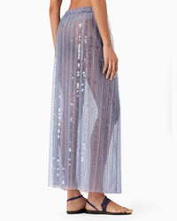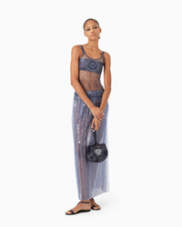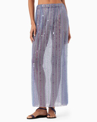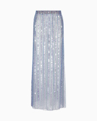 This long tulle skirt is embellished with opulent, radiant embroidery produced by the mastery of Made in Italy artisanship. A vertical motif, brought to life by sequins, baguette beads and beads in shades of grey and light blue and topped by a light layer of tulle lit up by two-toned heat-sealed sequins, creates a special piece with an evocative radiance. Product Code: 3SHNR00YT03XL1PZ01 Details Composition 100% Polyamide Elasticated drawstring waist All-over vertical embroidery created with baguette beads, beads and sequins in shades of grey and light blue Lined Made in Italy