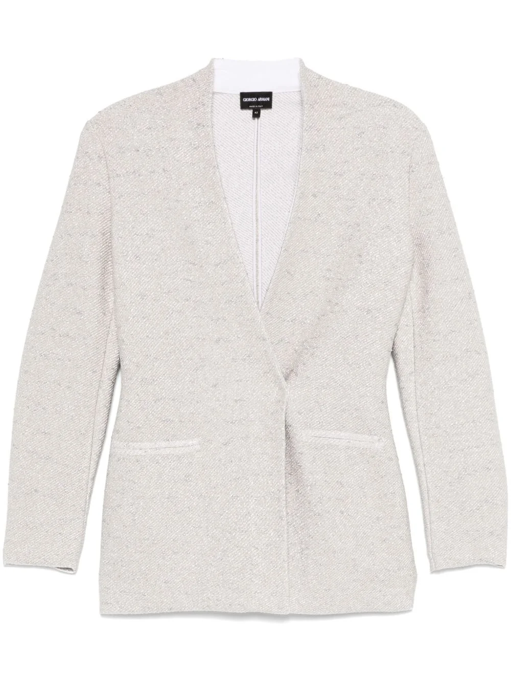 lurex blazer Highlights - White - Double-breasted press-stud fastening - Two front welt pockets - No lapels - Long sleeves Made in Italy Composition Viscose 44%, Virgin Wool 39%, Metallic Fibre 9%, Polyamide 7%, Elastane 1% SIZE & FIT Model measurements Height 5 ft 11 in(1.8 m) Bust/Chest 32.67 in(83 cm) Hips 35.82 in(91 cm) Waist 25.98 in(66 cm) FittingInformation Designed for a slim fit that sits just away from the body offering a close yet comfortable fit The internal shoulder pads offer a structured shape Made from a midweight stretch fabric, this piece offers elasticity and flexibility when worn