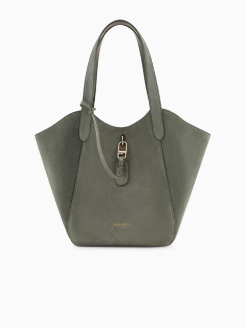 Medium handbag made of suede, available in the collection colour palette. The style combines a square shape with a deconstructed, unlined construction with a draped look. Featuring a distinctive metal ring and snap-hook closure, it is embellished with a practical zipped, detachable internal pouch perfect for your mobile phone. A versatile, feminine offering, designed for everyday use, perfectly in keeping with the ready-to-wear colours and inspirations. Double handles Ring and snap-hook clasp Inner zip pouch, small patch pocket and hot-stamped logo Unlined Measurements: 32 x 44 x 24 cm Made in Italy Product Code: GW000821AF14186U7047