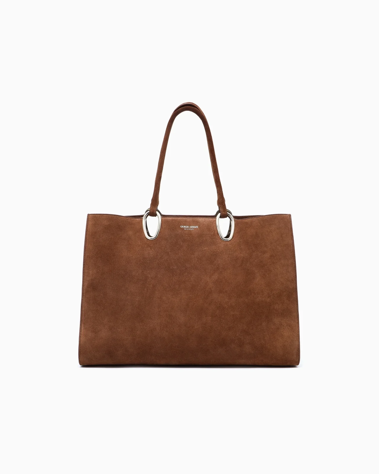 Shopper bag made of suede, featuring essential, clean lines, illuminated by a teardrop-shaped, light gold-coloured metal detail that acts as an attachment to the tubular double handles. The style features a concealed button closure, two internal pockets, one with a zip fastening, and is customised with a heat-stamped Giorgio Armani logo on the front panel. A spacious, lightweight and functional item, perfect for day use and can be carried on the shoulder or by hand. Tubular double handles Teardrop-shaped metal rings detail Concealed internal button closure Suede interior Interior pocket with zip One internal patch pocket Light gold-coloured metal plating Heat-stamped Giorgio Armani logo on the front panel Measurements: 39 x 15 x 28.5 cm Made in Italy Product Code: GW001717AF14186U6095