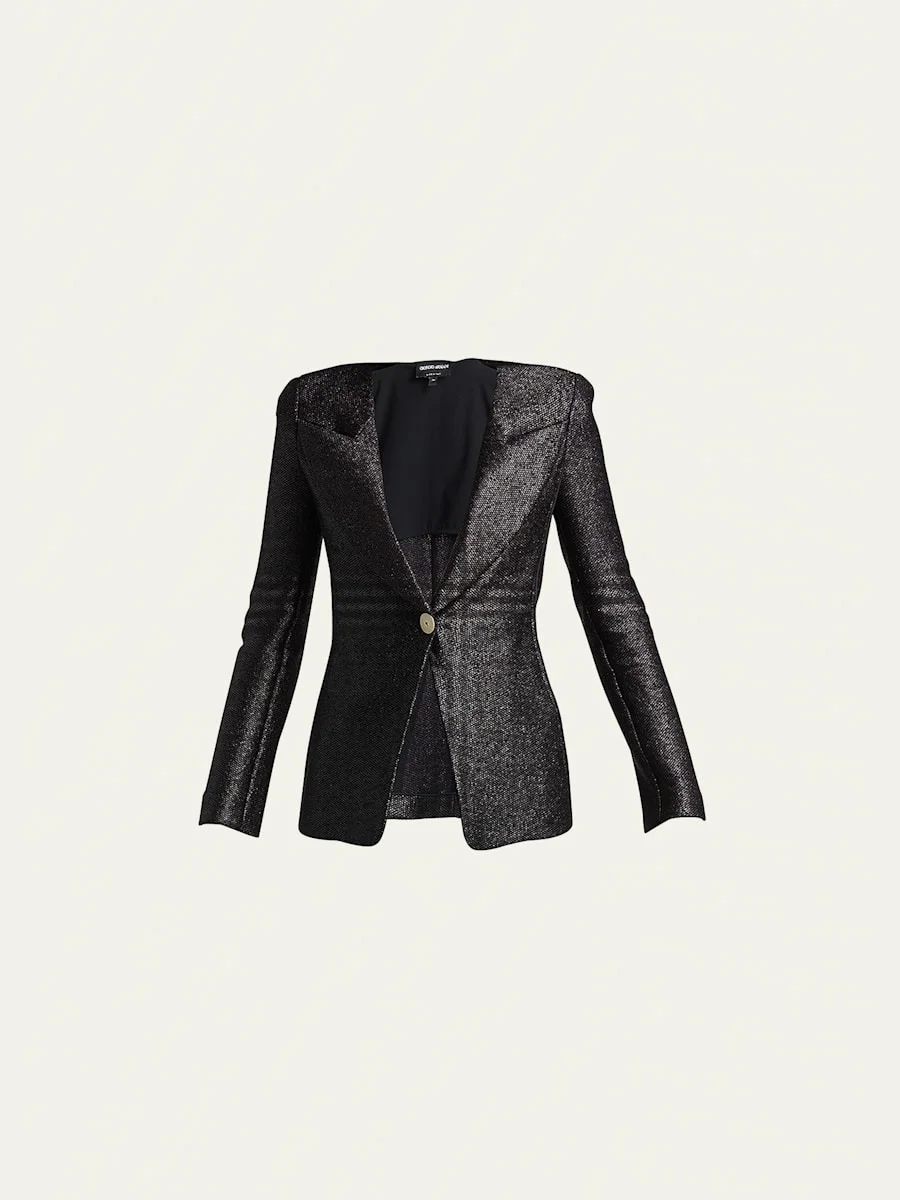 Giorgio Armani blazer with Rafia motif and novelty buttons Peak lapels; single-breasted front Long sleeves; button cuffs Tailored fit Cotton/polyester Made in Italy Model is 5'10"/177cm. Online Inquiries: BGS21_B6VDW| Store Inquiries: #4208225