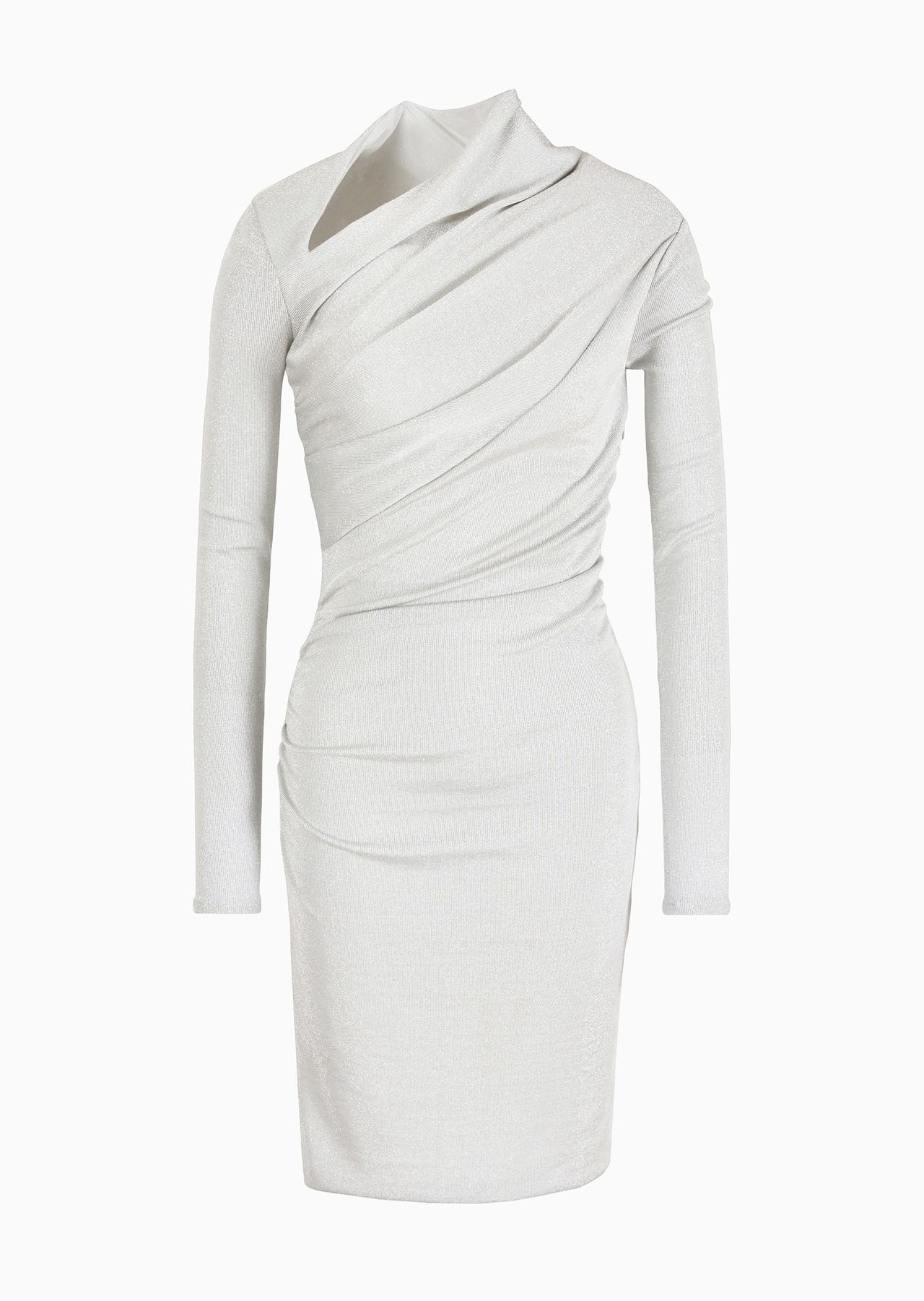 Bright short dress made of viscose jersey and Lurex, designed to dress the feminine silhouette with elegance. The style features an asymmetric neckline detail and a delicate drape on the front for added movement. The garment is part of an exclusive capsule collection dedicated to special occasions, reflecting the iconic vision of elegance through the brand’s style codes. A glamorous item in a white and silver colour palette, with unexpected touches of turquoise, and shimmering embroideries and appliques that provide sophisticated sparkles. Product Code: 3DAA80AJAIZ1U9W6 Details Composition 73% Viscose 17% Metallic fiber 10% Polyamide Slight upright collar Cut-out detail on the neckline Long sleeves Front draping Length: 50 cm from the waistline Made in Italy