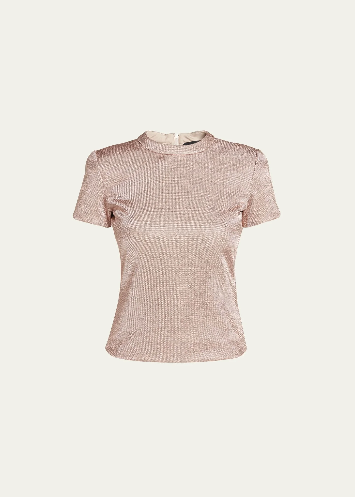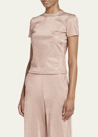 Shiny T-shirt made of viscose bonded jersey, with lurex yarn adding a distinctive sparkling effect. The short-sleeved, crew-neck style will complete numerous outfits with a brilliant, sophisticated touch, adapting to different occasions. Product Code: 3DAM50AJAHZ1U4FS Details Composition 72% Viscose 28% Metallic fiber Crew neck Short sleeves Back central zip fastening Made in Italy Fitting The model is 178 cm tall and is wearing size 38/S
