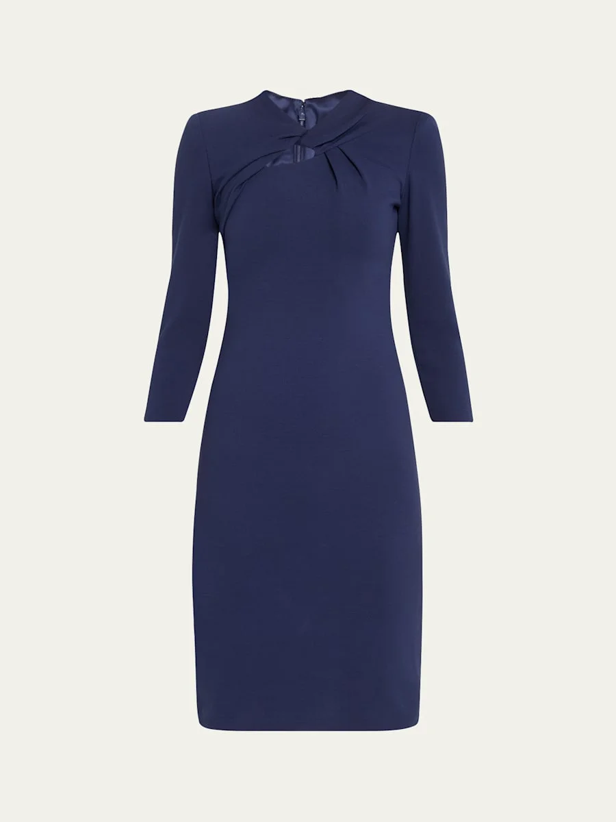 Giorgio Armani jersey dress features a twist front detailing at the neckline V-neckline Long sleeves Hem falls above the knee Sheath silhouette Concealed zip closure Viscose Dry clean Made in Italy Model is 5'10"/177cm. Online Inquiries: BGS21_T5UAH| Store Inquiries: #4825379