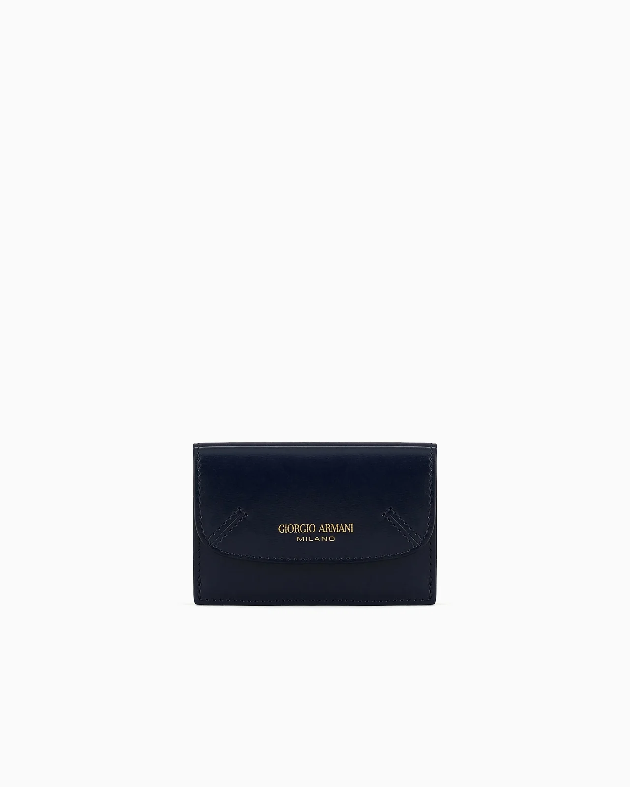 La Prima trifold wallet that evokes the bag’s rounded silhouette, defined by softened edges that are reminiscent of jacket darts. This mini version is made from palmellato leather and features a button closure, card slots, a banknote compartment and coin purse. The gold-finish, heat-stamped Giorgio Armani logo customises the accessory. Press-stud closure Banknote compartment Coin purse with snap-button closure Heat-stamped, gold-finish Giorgio Armani logo Measurements: 7 x 9.8 x 3.5 cm Made in Italy Product Code: Y1H381YTF4A80013
