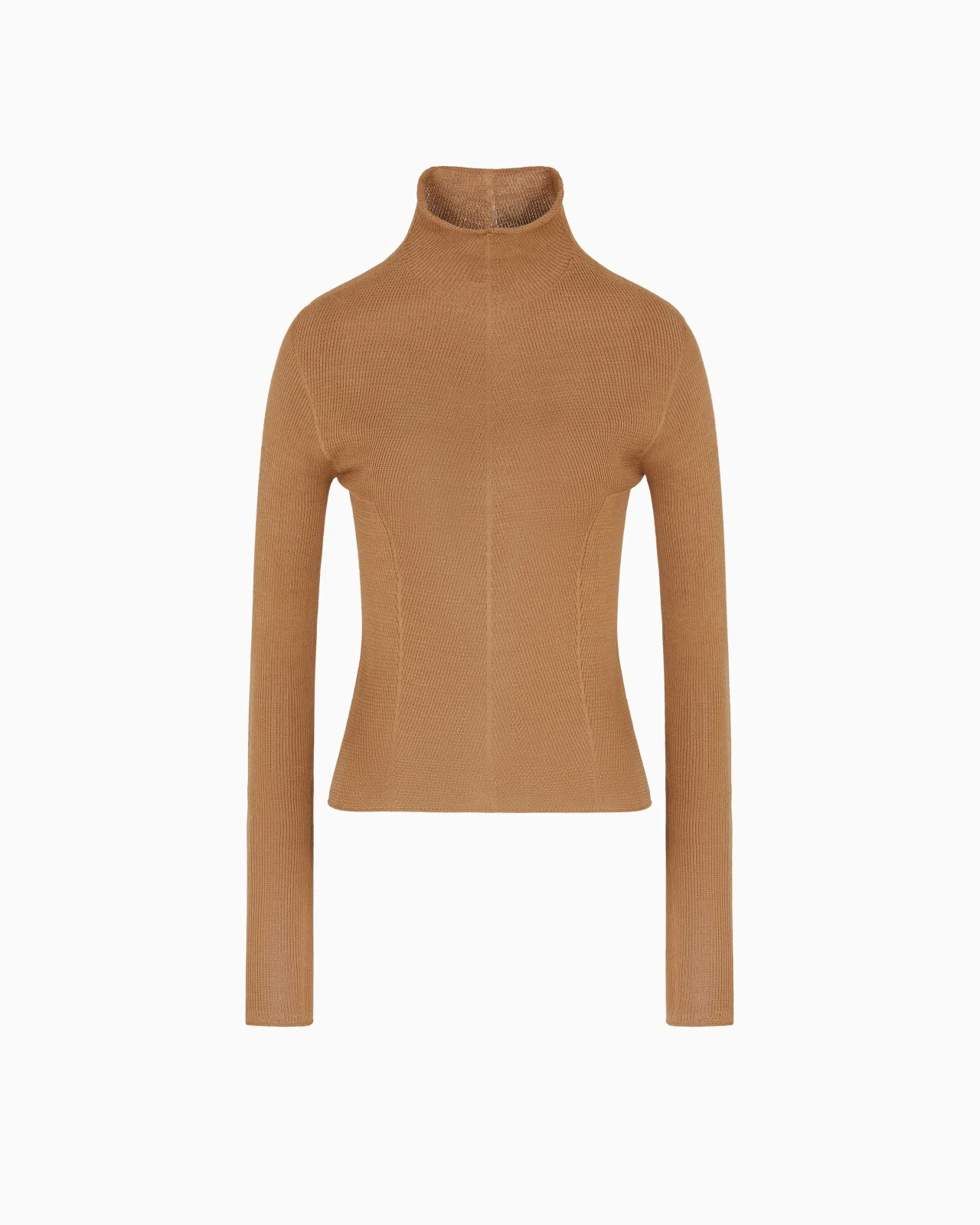 Essential and minimalist: this mock-neck jumper is crafted from textured silk and elegantly adorns the feminine silhouette. A versatile offering that is perfect worn under a jacket or paired with the collection's pleat-front trousers for a casual daywear look. The piece is part of the New Normal selection, an offering that reinterprets the brand’s archive looks with a modern twist. Pieces in elongated and fluid shapes and with an androgynous flavour dress the feminine silhouette with elegance for day-to-night looks. This season it comes in a natural colour palette animated by a series of chevron motif and houndstooth shapes, a clear reinterpretation of pieces "stolen" from the male wardrobe with a feminine twist. Fineness: 18 Mock neck Long sleeves Made in Italy Product Code: GW002112AF19705U6036
