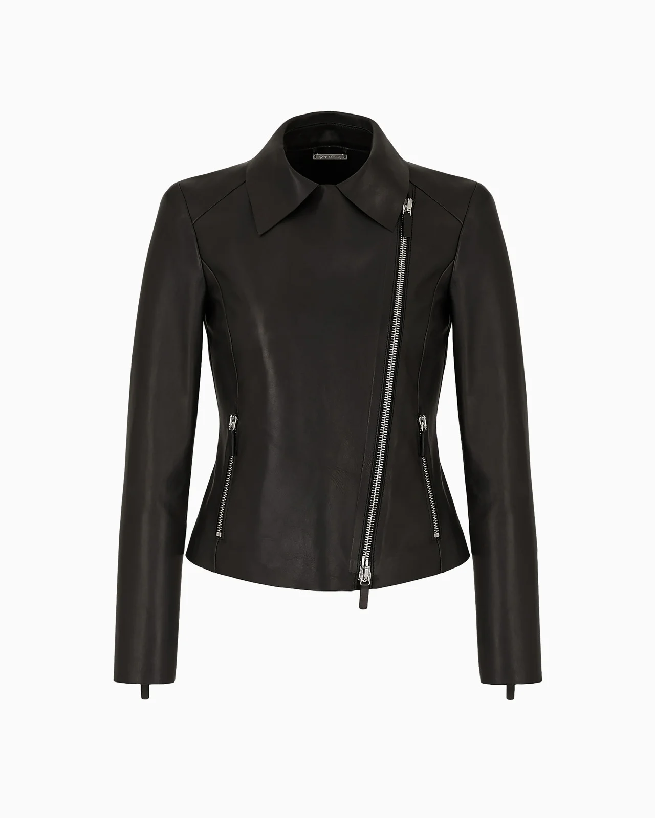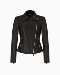 The revisitation of the biker jacket according to the Giorgio Armani style. Jacket made of soft plonge nappa lambskin defined by the collar with lapels, off-center zip closure, straps on the sides, zip pockets and cuffs with open bottom with zip. Heat-welded internal parts. Collar with lapels External zip pockets Zip Unlined interior Cuffs with zip Made in Italy Product Code: 0AB30P0AP30999
