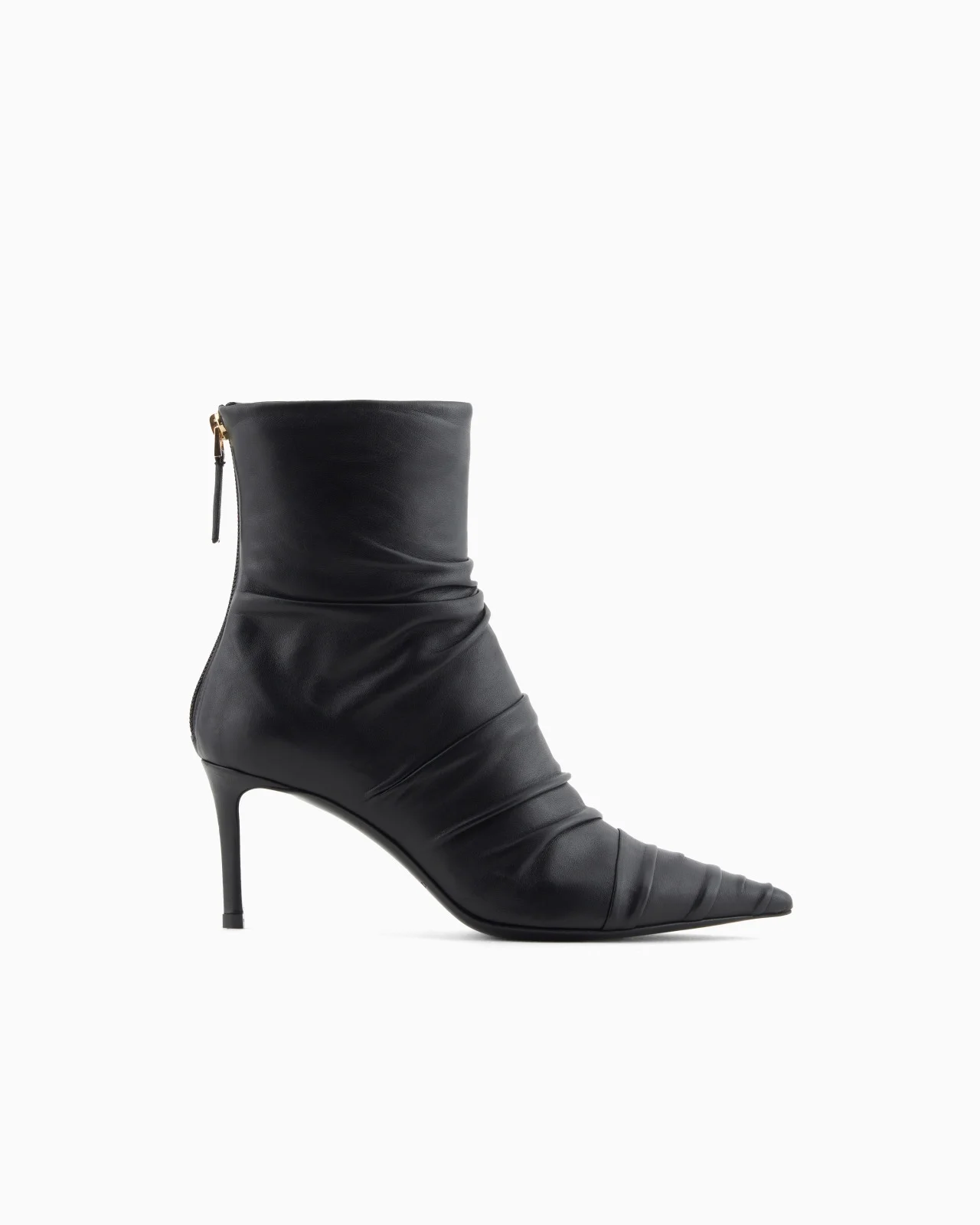 Sophisticated ankle boots made from supple nappa leather with a zip fastening on the heel. The style features a sophisticated construction, which wraps around the foot simulating the folds of a foulard, enhancing the suppleness of the leather. An offering that recalls Armani stylistic codes, perfect for various occasions. Pointed toes Zip closure on the heel with leather pull tab Leather insole with stitched logo label Leather soles with rubber inserts Stiletto heels Heel height: 7 cm Made in Italy Product Code: GW002127AF18046UC001