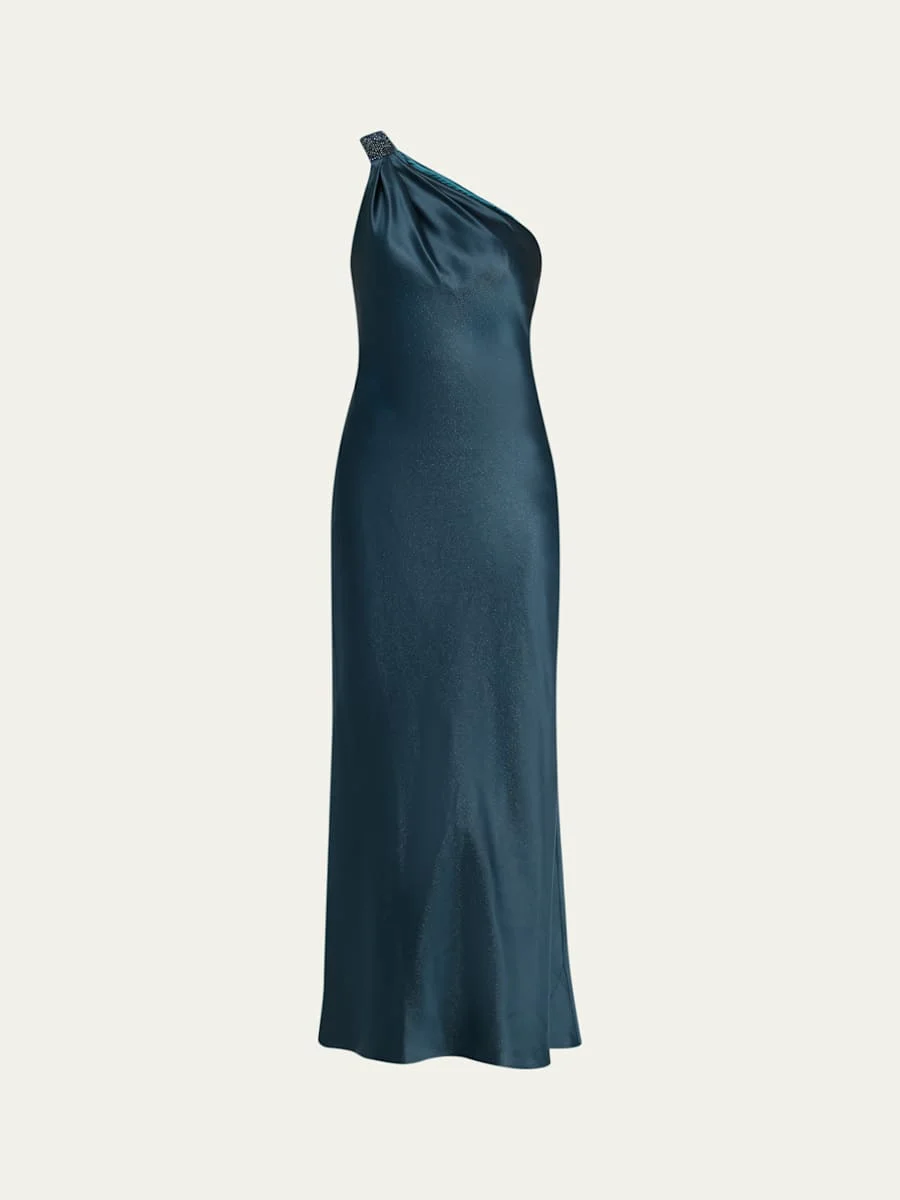 Crafted from shimmering and lustrous satin, this dress from Giorgio Armani features a gathered shoulder with a crystalembellished detail Oneshoulder neckline Sleeveless Aline silhouette Ankle length Invisible side zip Viscose Made in Italy SIZE amp; FITModel measurements: 5'10" tall Model is wearing a US size 4/Small