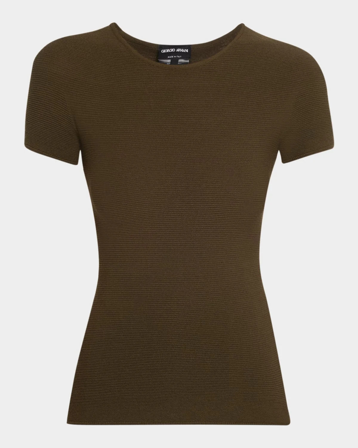 Giorgio Armani Tshirt is crafted of horizontal Ottoman knit Scoop neckline Short sleeves Fitted Pullover style Viscose/polyester Dry clean Made in Italy