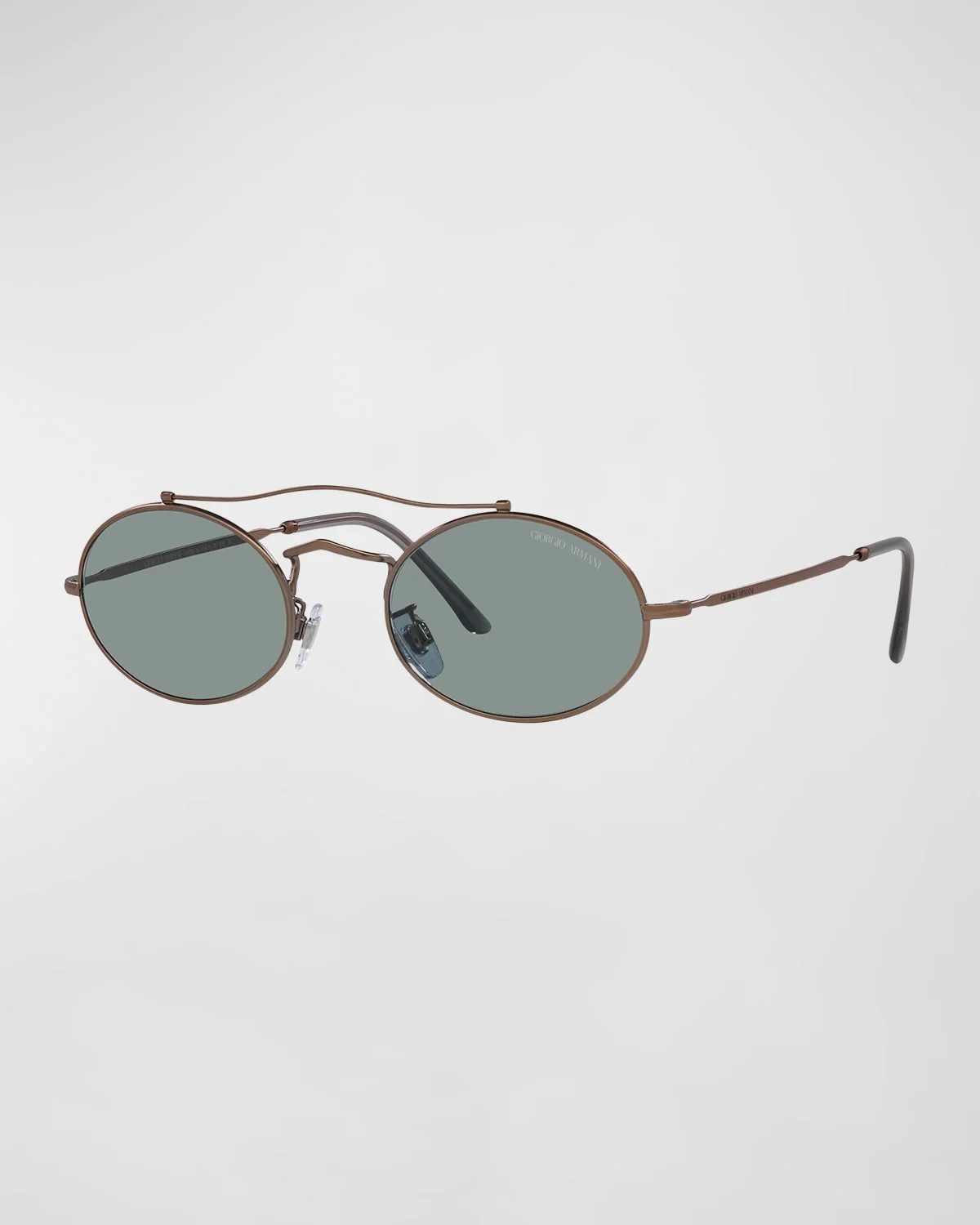Giorgio Armani oval aviator sunglasses in metal and crystal Lens/bridge/temple (in mm): 5121145 Solid lenses Adjustable nose pads Logo on temples Thin, tapered arms Capped earpieces Style is Rxable 100% UVA/UVB protection Made in Italy
