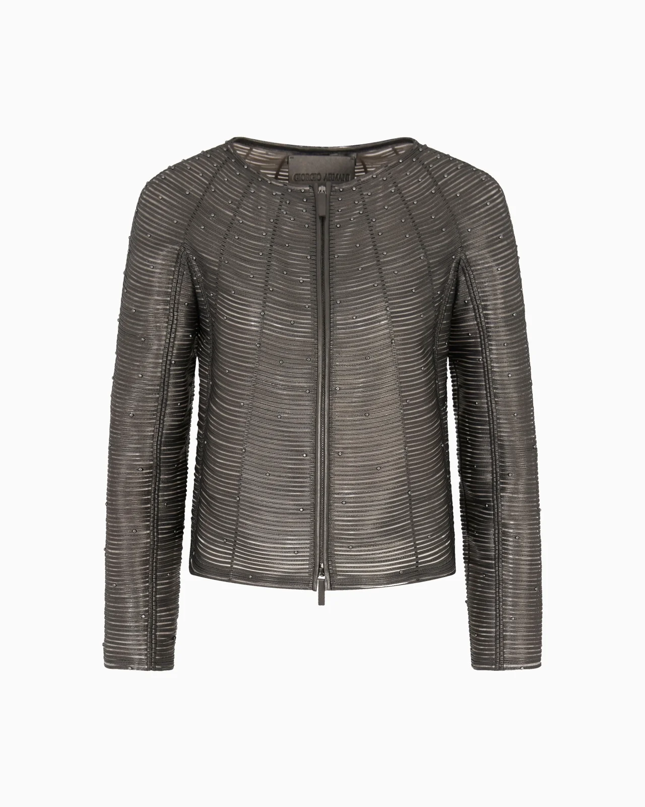 The result of expert Made in Italy artisanal craftsmanship, this short jacket made from pearlised nappa leather is a head-turner thanks to its distinctive design that creates a barely there embroidered effect. Featuring a basketweave effect on a sheer, feather-light tulle base, it features a zip fastening and long sleeves. A luxurious and sophisticated piece, embellished with studs, it adds one-of-a-kind style to a wide array of looks. Crew neck Zip closure Long sleeves Nappa-leather trims Basket weave on a tulle base Applied matching studs detail Length: 47.5 cm Lined Made in Italy Product Code: GW001248AF16303U6128