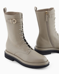 Combat boots made from supple, pebbled calfskin with clean, versatile lines. Featuring matching waxed laces, and embellished with a leather goods-style strap with a metal buckle, this style has a comfortable fit thanks to the side zip. The covered welt and lightweight micro sole complete this offering with an urban, modern twist, perfect for everyday wear. Smooth calfskin uppers Waxed laces Side zip closure Strap with metal buckle Welt covered in pebbled calfskin Micro soles Made in Italy Product Code: GW001516AF20456U6172