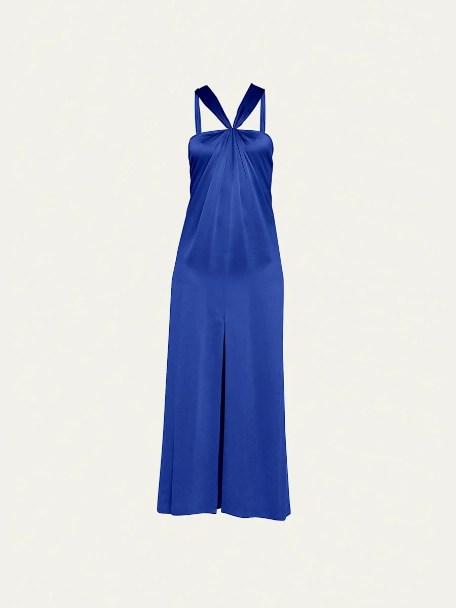 Pleated Halter Slit-Hem Silk Gown