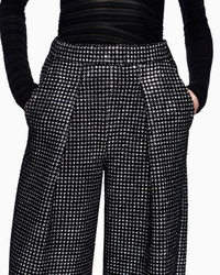 Shiny jersey trousers animated by a two-tone flocked print and embellished by the application of sequins. Designed to complete looks with a special touch, it features a smooth waistband, side zip closure and two side pockets. Perfect teamed with the matching waistcoat for a special, shimmering outfit. The piece is part of the New Normal selection, an offering that reinterprets the brand’s archive looks with a modern twist. Pieces in elongated and fluid shapes and with an androgynous flavour dress the feminine silhouette with elegance for day-to-night looks. This season it comes in a natural colour palette animated by a series of chevron motif and houndstooth shapes, a clear reinterpretation of pieces "stolen" from the male wardrobe with a feminine twist. Single-pleat trousers Smooth waistband Side zip closure Two slant pockets Length from the waist: 107 cm Made in Italy Product Code: GW002171AF19855FC056
