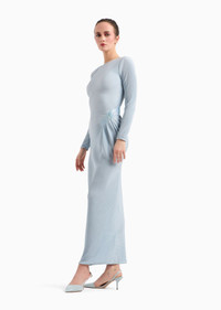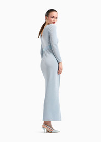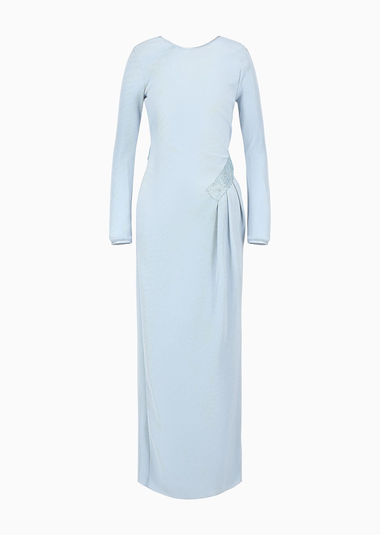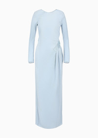 This long dress is made of pleated stretch jersey which is soft to the touch and comfortable to wear. The garment features a pleated motif and an insert with graduated crystal embroidery which falls from the waist down one side. An elegant, sophisticated dress, perfect for a variety of occasions. Product Code: 3DAA56AJLXZ1U9RB Details Composition 58% Triacetate 42% Polyester Crew neck Long sleeves Rounded back neckline Gentle gathering at the side Peplum detail at the back of the waist Length: 105 cm from the waist Made in Italy Fitting The model is 178 cm tall and is wearing size 38/S