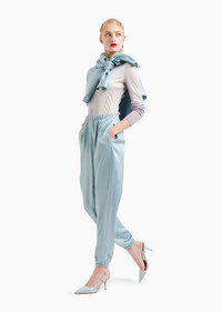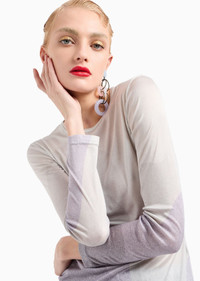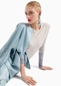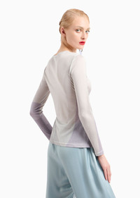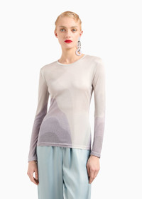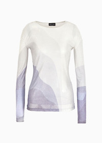 Sophisticated crew-neck jumper made from pure silk interlock. The slim-fitting style features a digital print with a gradient wave motif, a recurring theme of the collection. A romantic, ethereal style, perfect for wearing under a jacket. Product Code: 3DAM57AJJKZ1PZB3 Details Composition 100% Mulberry silk Crew neck Long sleeves Gradient digital print with wave design Made in Italy Fitting The model is 178 cm tall and is wearing size 38/S