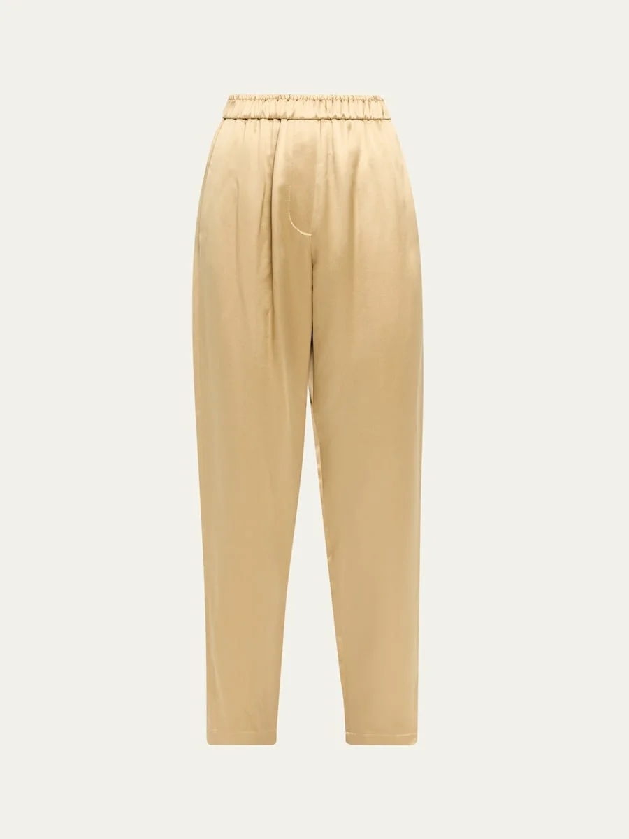 Giorgio Armani satin trousers featuring an elasticized waistband High rise Side slip pockets Back patch pocket Relaxed wide legs Full length Pull-on style Silk Dry clean Made in Italy Online Inquiries: BGS21_BA4Z1| Store Inquiries: #5037530