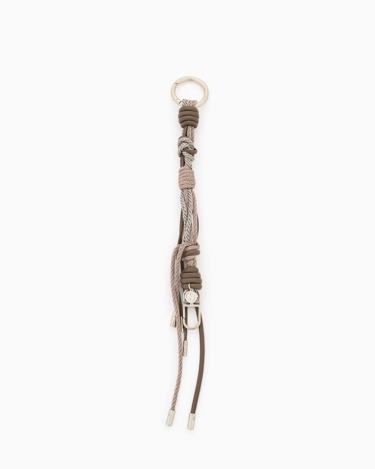 Keyring made of smooth leather and rope. The style features both a keyring and a practical snap hook. An accessory that adds a modern touch. Metal snap hook Charm with metal GA logo Made in Italy Product Code: GW003287AF26219U6190