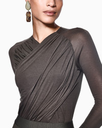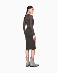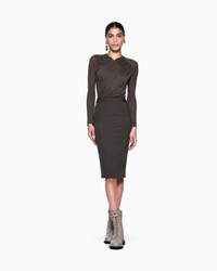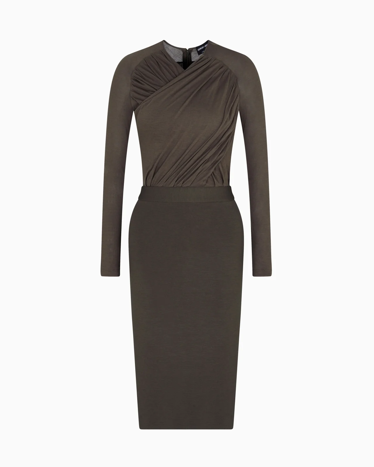 Midi dress made of Lyocell jersey, a semi-synthetic fibre that is produced from eucalyptus trees and has an exceptionally low impact on the environment. It is valued for its excellent durability, absorbency, breathability and crease resistance. The piece is distinguished by its front drape that elegantly wraps around the bodice, creating a flattering cross-over effect. Long sleeves and a figure-hugging pencil skirt define the garment’s feminine, tapered silhouette, making it perfect for wearing on various occasions. V neck Long sleeves Cross-over draping on the bodice Back central concealed zip fastening Central back vent Length: 65 cm from the waist Made in Italy Product Code: GW002160AF15963U8101