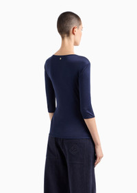 Soft silk-viscose jersey V-neck jumper. The three-quarter sleeved style features a twisted detail that embellishes the front. Wear it under a jacket in refined office looks or for special occasions. Product Code: 6DAM51AJHWZ1UBW6 Details Composition 50% Silk 50% Viscose V neck Three-quarter sleeves Twisted detail at the neckline Small gold metal GA logo at the back Made in Italy Fitting The model is 178 cm tall and is wearing size 38/S