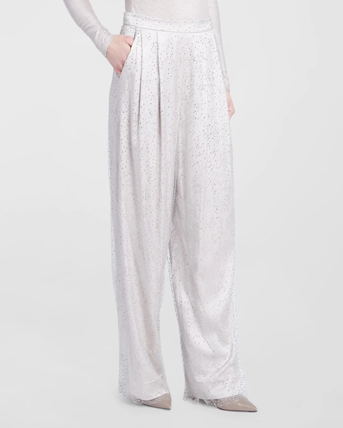 Giorgio Armani satineffect trouser pants feature beaded detailing Flat front Midrise; sits high on hip Hook/zip fly; belt loops Straight legs Full length Polyamide Lining: Silk Dry clean Made in Italy
