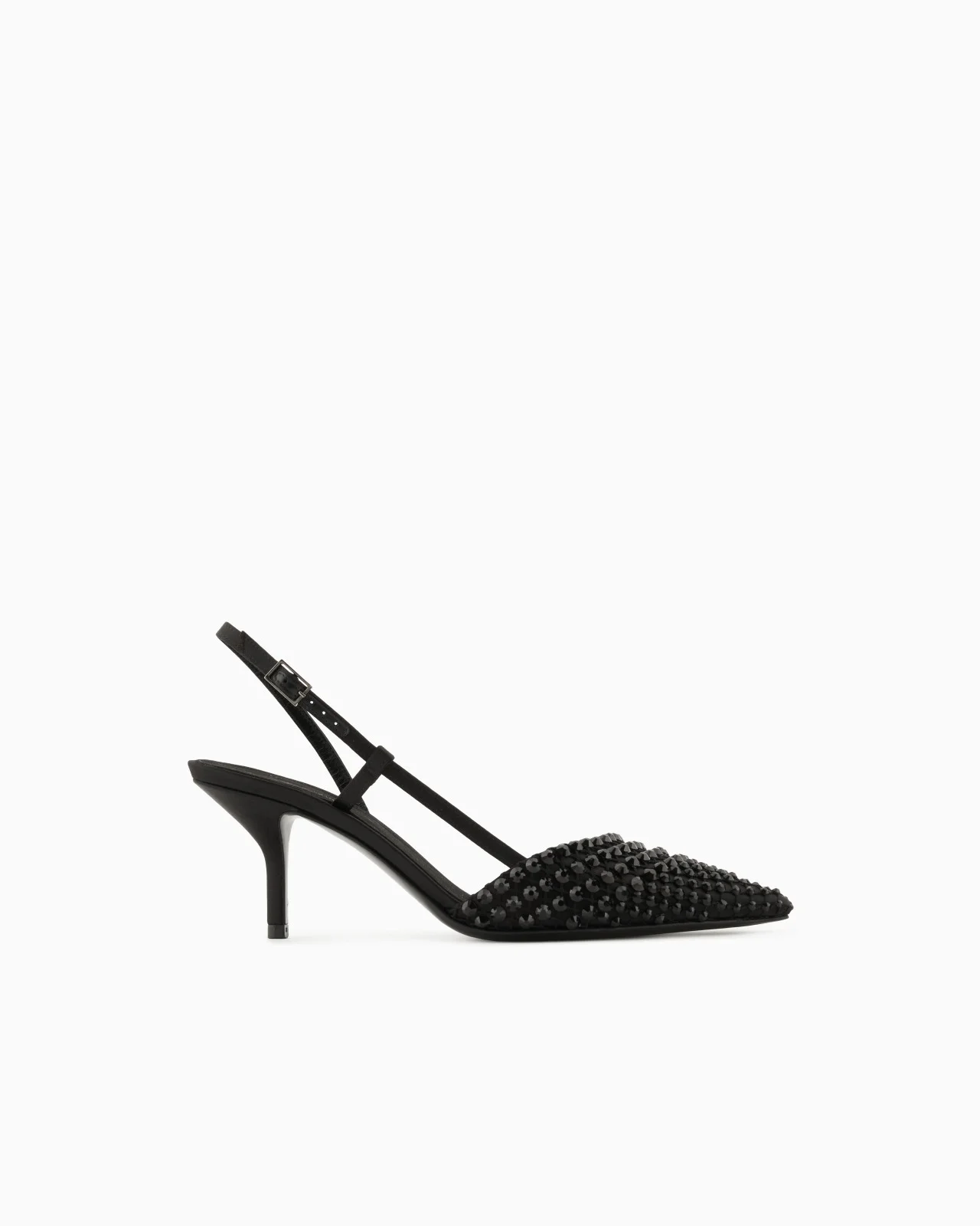 Elegant slingbacks made of satin and mesh and lit up by matching rhinestones. The style with a slightly asymmetric neckline comes in deep evening shades and features a comfortable height stiletto heel and an adjustable strap for a perfect fit. Delicate and feminine, they complete numerous looks with a sophisticated touch.<br>The shoe is part of the exclusive collection that celebrates the connection between Giorgio Armani and the world of Hollywood. A colour palette of deep blues combines with a profound and ever-elegant black, to create a sparkling, luxurious selection inspired by the limelight and most exclusive Hollywood parties. Extremely sophisticated pieces with iconic lines are made of velvets, silks and satins enlivened by crystal and rhinestone embellishments and refined workmanship. Looks for him and her, designed for evenings and special occasions. Pointed toe Slightly asymmetric top line Adjustable strap Insole with signature logo Leather soles with rubber toes Covered stiletto heel Heel height: 6.5 cm Made in Italy Product Code: X1E957XR440D593