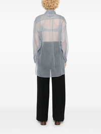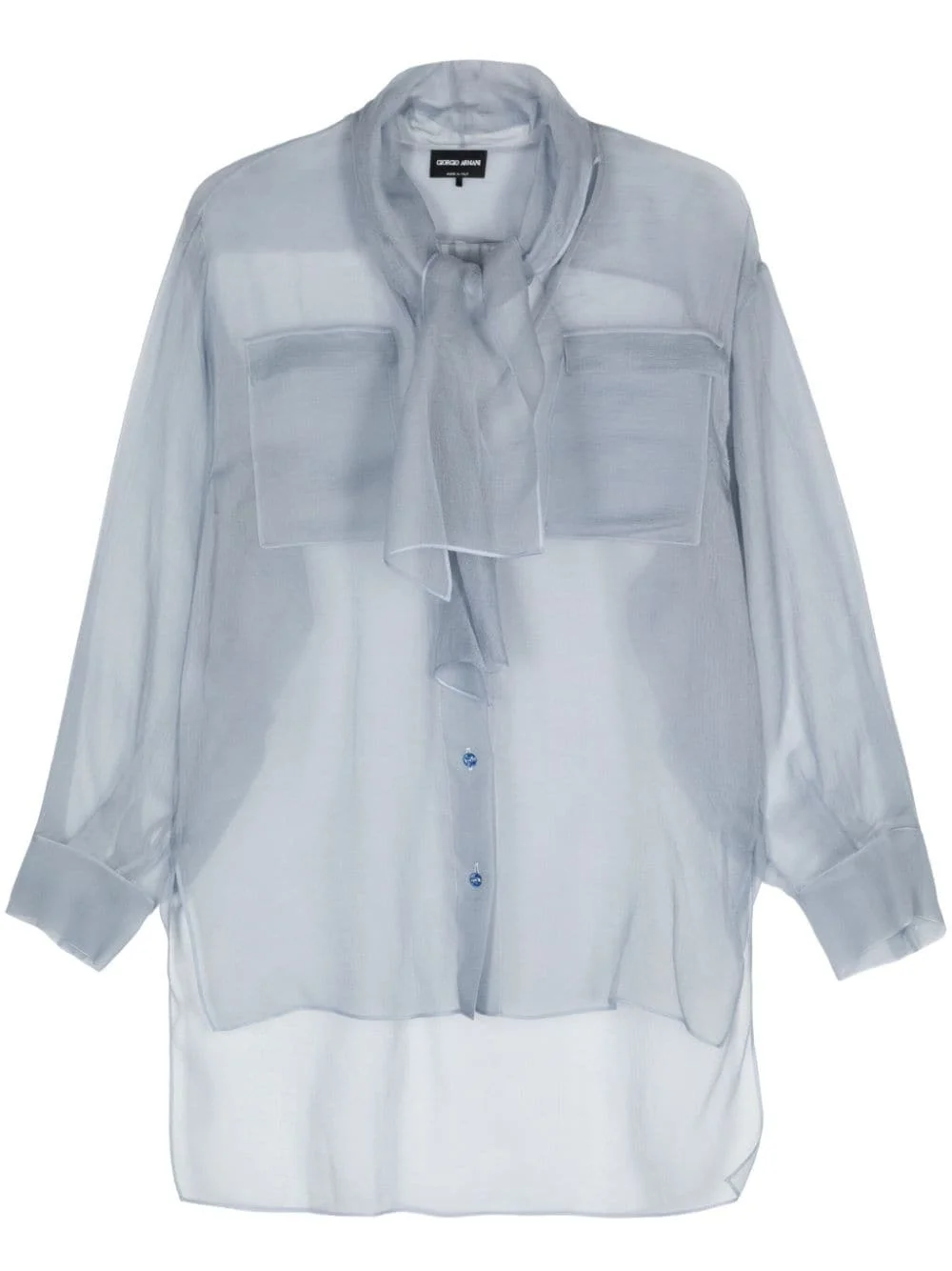 scarf-detail organza shirt Highlights - Light blue - Silk - Organza - Semi-sheer construction - Attached scarf - V-neck - Long sleeves with buttoned cuffs - Chest flap pockets - Short side slits - High-low hem - Front button fastening Made in Italy Composition Silk 100% SIZE & FIT Model measurements Height 5 ft 9 in(1.75 m) Bust/Chest 34.64 in(88 cm) Hips 36.61 in(93 cm) Waist 26.37 in(67 cm) FittingInformation Designed for an oversized fit, offering additional room throughout Made from a lightweight non-stretch fabric This piece fits true to size – take your usual size